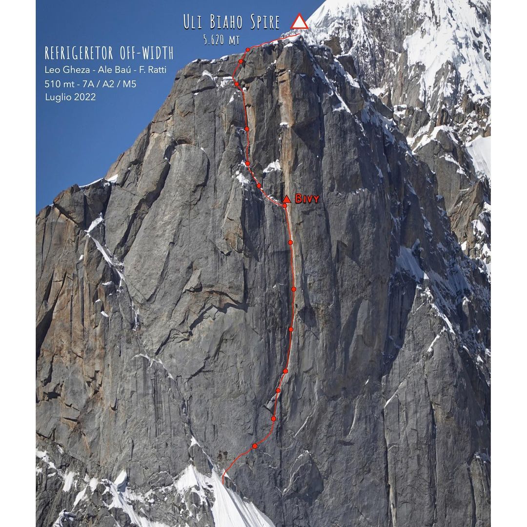 (Pakistan) Prima salita di Refrigerator Off-Width (7a, A2 e M5) sulla parete est dell'Uli Biaho Great Spire (5.594 m), Baltoro Muztagh, dal 22 al 23 luglio, di Alessandro Baù, Leonardo Gheza e Francesco Ratti. Quindici chiodi utilizzati per la protezione. Discesa in corda doppia.