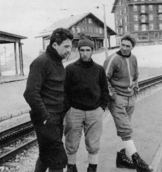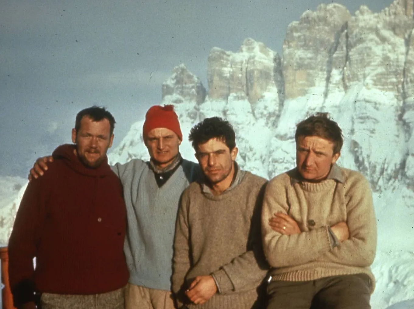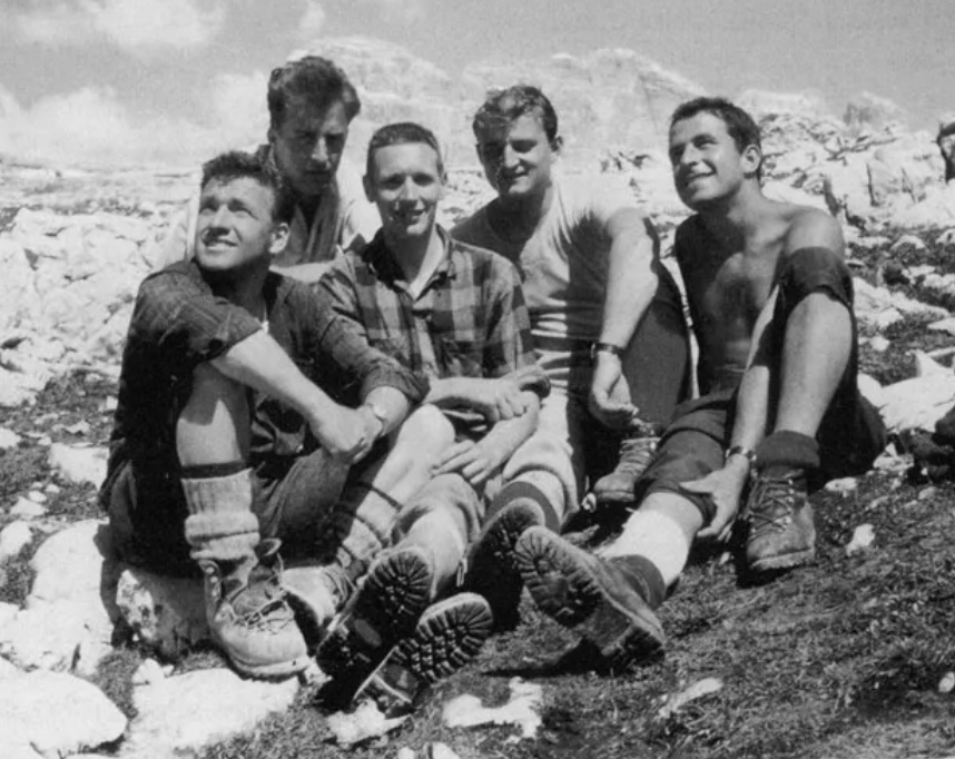 Terzo da sinistra con Hiebeler, Piussi e Redaelli prima dell'invernale alla Solleder-Lettenbauer