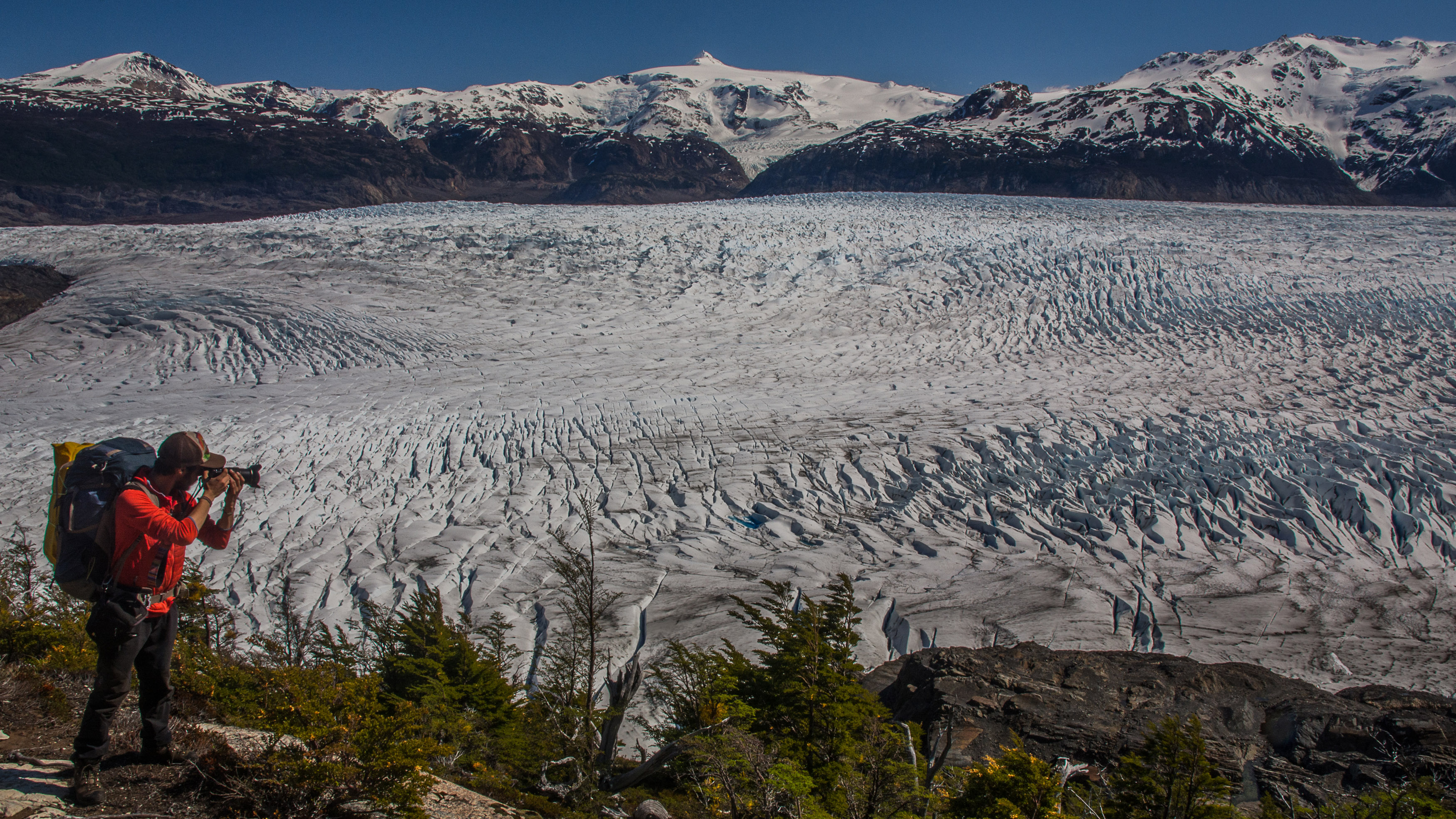 Trekking lungo il ghiacciaio Grey. © Archivio di Marco RossoIl massiccio del Paine riposa silenzioso e imponente; i suoi versanti rocciosi sono ricoperti di neve e sugli altopiani circostanti la vegetazione cresce selvaggia. Tutto intorno il silenzio è interrotto dal rumore dell’acqua del lago Pehoe, increspato dal soffio del vento. È qui, nel Parco naturale Torres del Paine, in Cile, che nel 2013 si è trasferito Marco Rosso. Originario della provincia di Padova, Marco si è licenziato dal suo lavoro di ingegnere meccanico per intraprendere un viaggio alla scoperta di sé e dei panorami che gli abitano dentro.