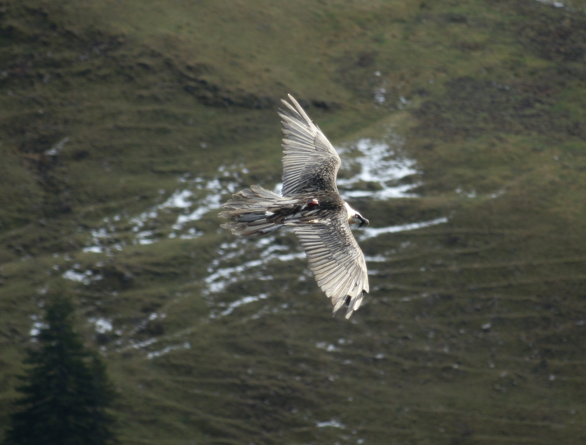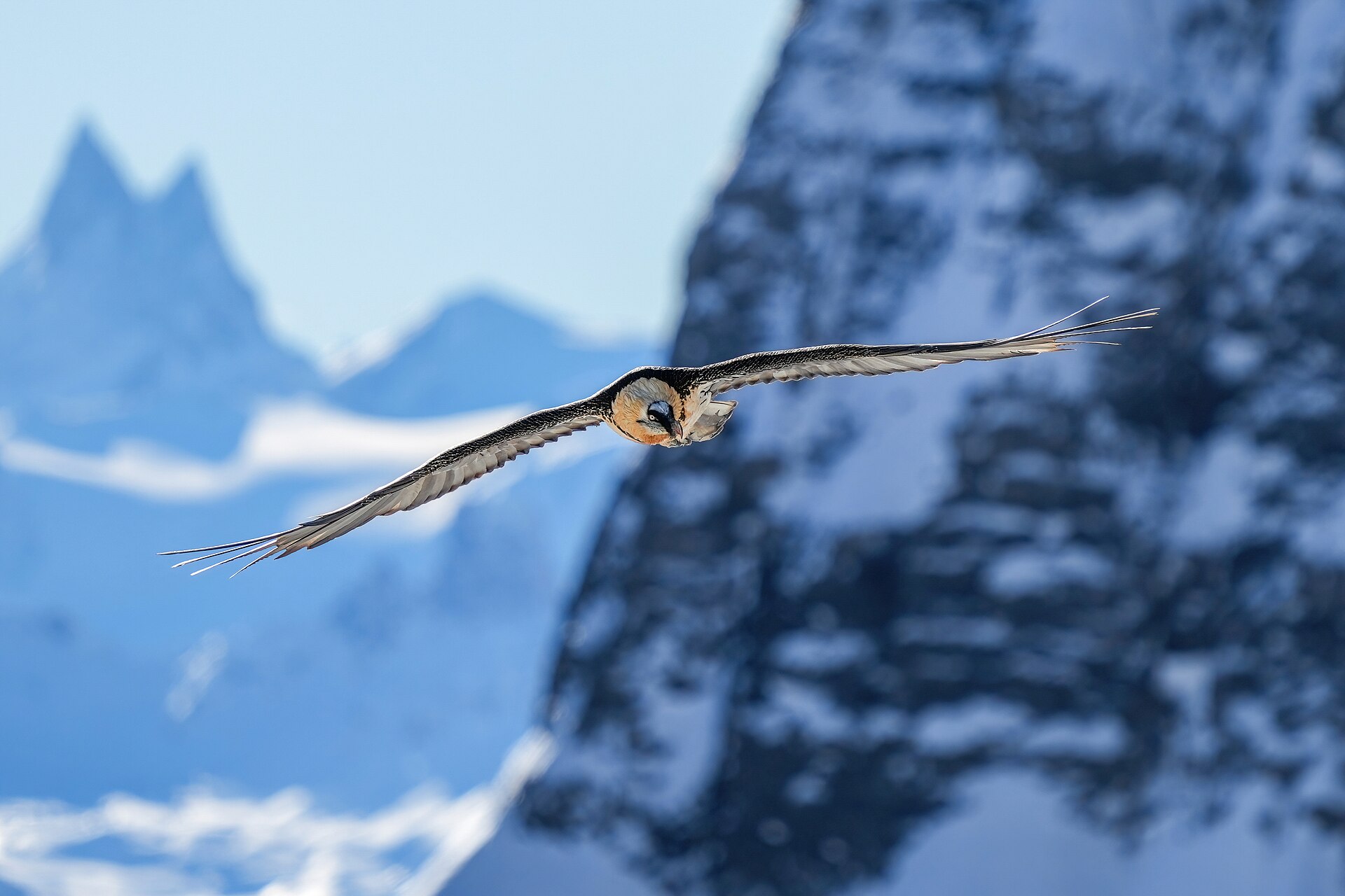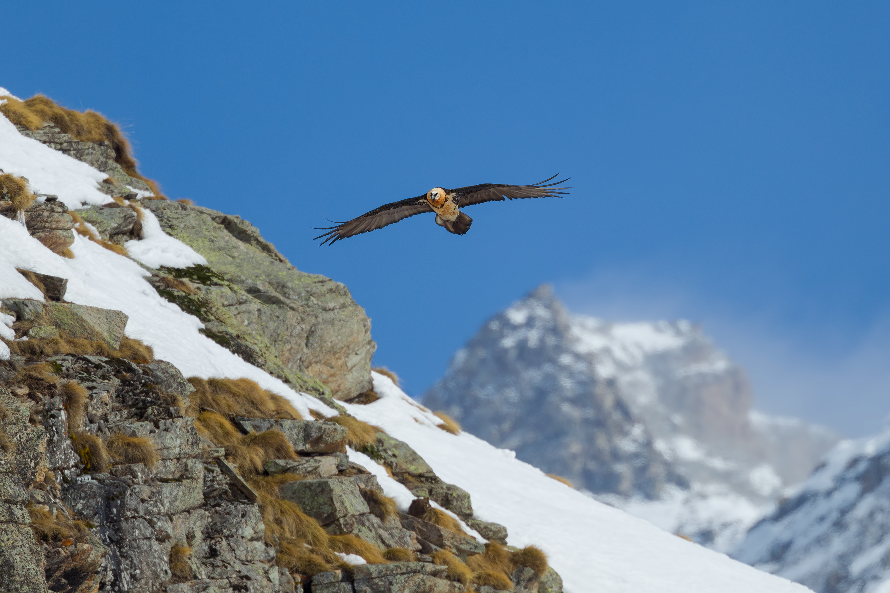 Un gipeto in cerca di carcasse a Pfyn-Finges, sulle Alpi svizzere © Giles Laurent, wikicommons