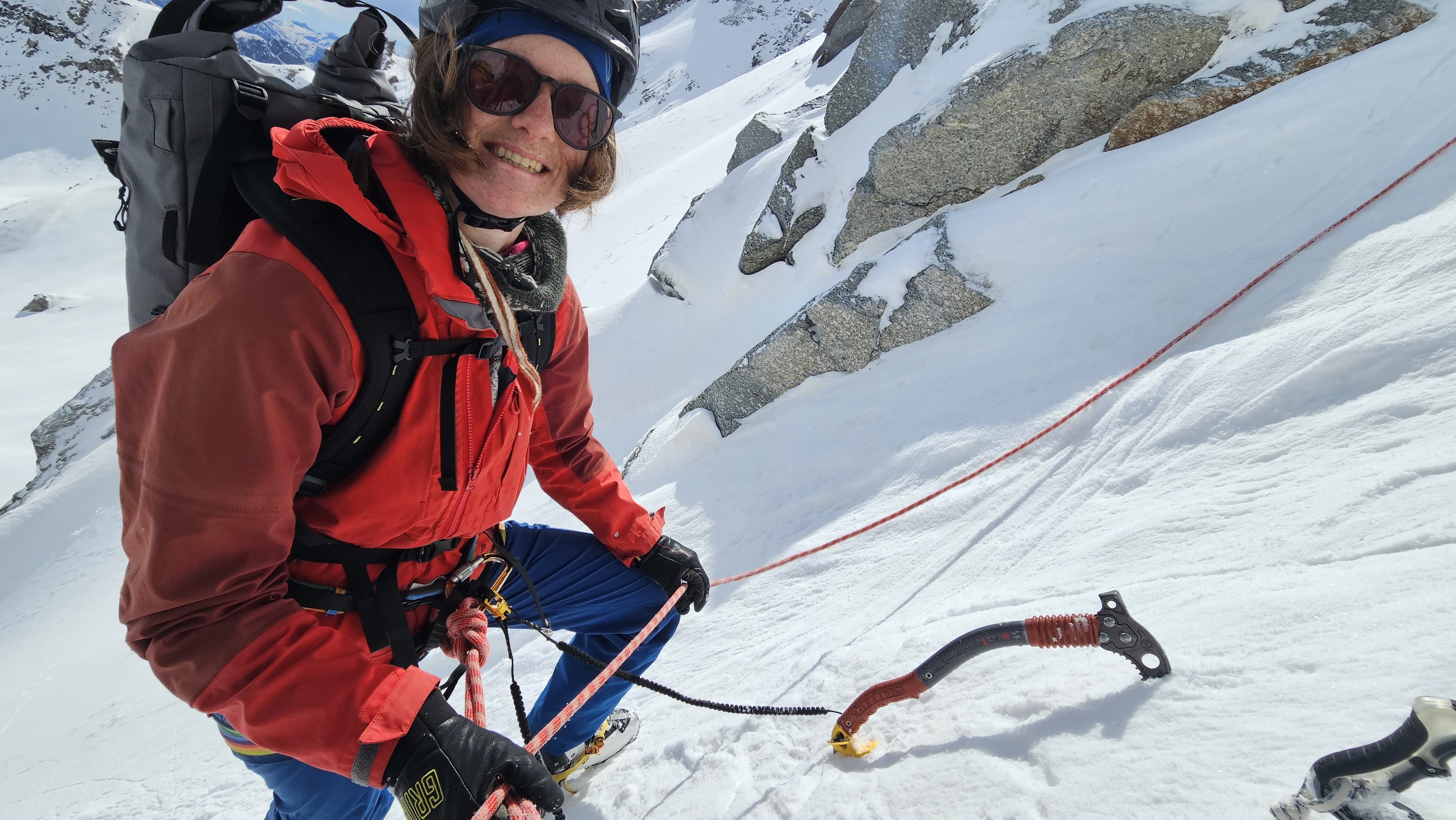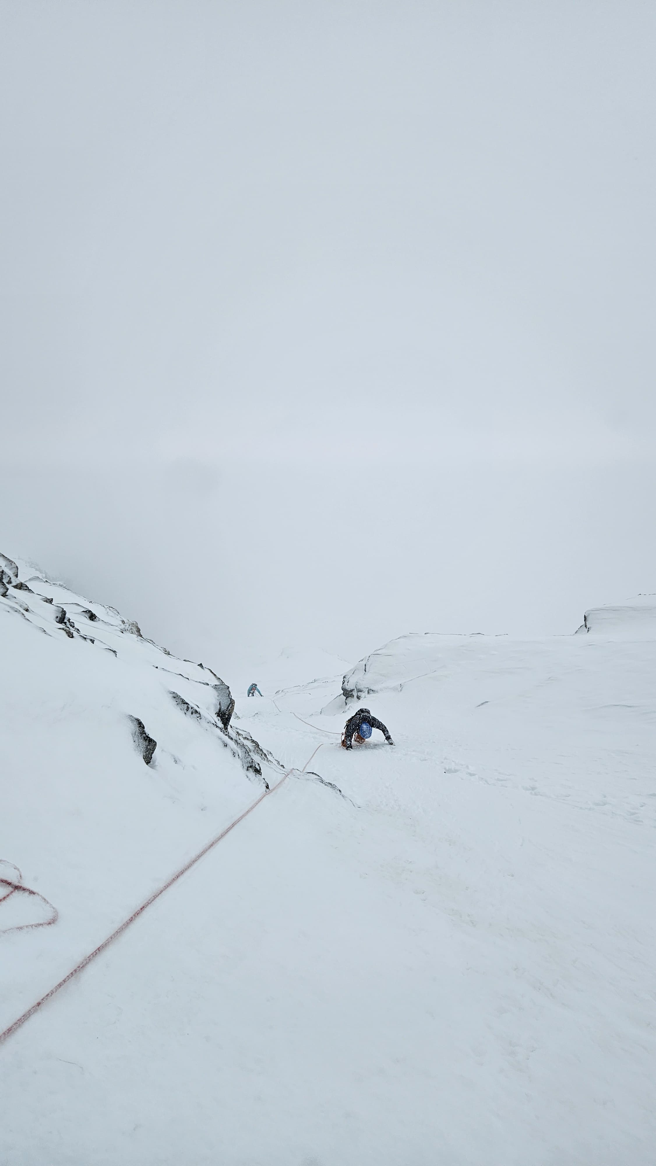 La neve reggeva i nostri passi senza farci affondare troppo, e noi ci alternavamo nel condurre la cordata quando, dopo aver scalato qualche centinaio di metri, il tempo è cambiato improvvisamente. In pochi secondi il sole è stato completamente avvolto dalle nuvole, con un conseguente rapidissimo abbassamento di temperatura. Anche noi, in pochi secondi, abbiamo iniziato a recuperare dagli zaini ogni strato possibile, per riscaldarci e proseguire nella salita, che non risultava particolarmente difficile. Avanzavamo con costanza, piantando le picche e sollevando i piedi in modo quasi meccanico ma efficace nel proseguire sotto una leggera nevicata. Così abbiamo raggiunto la prima difficoltà: una neve inconsistente su roccette. Matteo, tornato ad essere il primo di cordata, dopo aver salito questa prima difficoltà ci ha recuperati su una sosta attrezzata con il nostro materiale. In quel momento la neve cadeva più densamente, con spindrift che fanno presagire una ragliata per i tiri successivi. Intanto l'aria diventava sempre più umida e fredda.