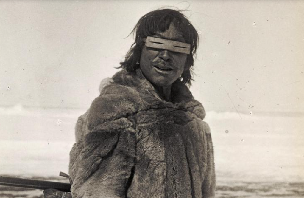 Uomo Inuk che indossa tavoletta di legno intagliata per proteggersi dal riverbero della luce sulla neve. Prototipo degli occhiali da ghiacciaio © Filippo Del Vecchio