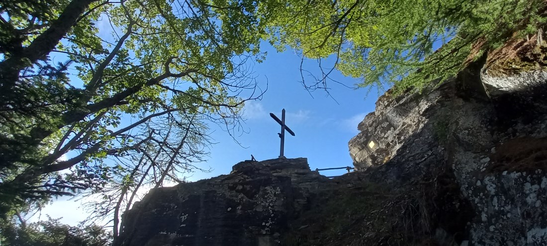 Ormai in vista della Croix de Bouque © Andrea GreciAssecondando le indicazioni per gli attacchi dei sentieri, si attraversa il borgo di Les Combes fino alla sua estremità superiore. Una ripida strada cementata porta alle paline gialle che indicano la salita per la Croix. Dopo un altrettanto ripido tratto su sentiero nel bosco, si oltrepassa la strada poderale e si procede con pendenza meno accentuata. Con alcune svolte si giunge a un bivio dove si mantiene la destra, assecondando le indicazioni per la Croix. Arrivati a un altro crocevia, si prosegue a sinistra ignorando il sentiero 5 per Plan Bry. Con un traverso si giunge a un fitto bosco cosparso di massi e con un ultimo tratto gradinato si giunge alla Croix de Bouque (1723 m, 1 h), ottimo punto di osservazione sul solco della Dora Baltea e sulle vette che segnano l’ingresso delle valli limitrofe.
