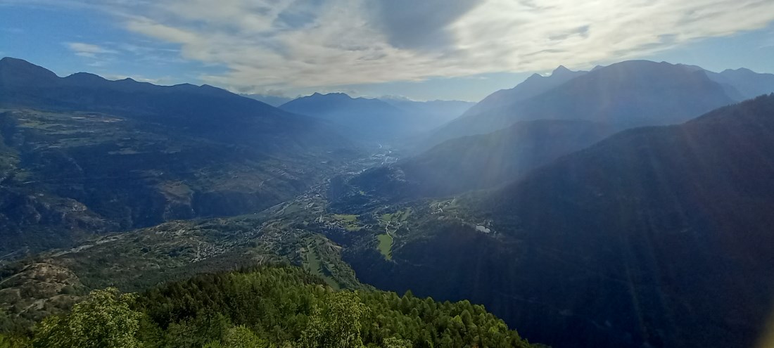 Controluce sul solco della Dora © Andrea GreciLa modesta elevazione che ospita la Croix de Bouque non è che l'ultimo dosso roccioso della lunghissima cresta che collega Pointe Grand Revers, Becca du Merlo e Mont de l’Ane. Nonostante la scarsa importanza orografica l'altura rappresenta un’ottima meta per i camminatori che vogliono compiere una breve escursione da Les Combes raggiungendo un appagante punto panoramico.