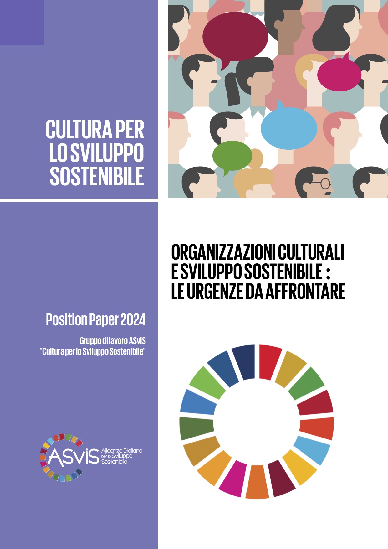 La copertina del nuovo position paper ASviSIl position paper individua alcuni nodi prioritari che devono essere affrontati per permettere la realizzazione degli Obiettivi dell’Agenda 2030 e per confutare alcuni stereotipi associati ai mondi della cultura che nascondono il peso e l’importanza delle organizzazioni culturali. Le “urgenze da affrontare” citate nel titolo del documento sono di tipo ambientale, economico e sociale.