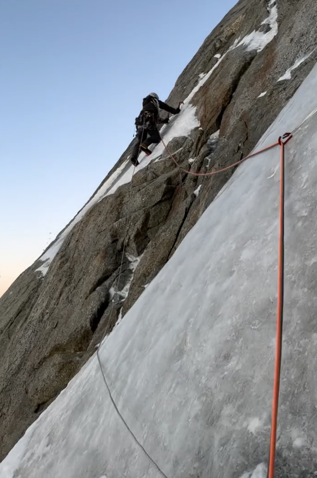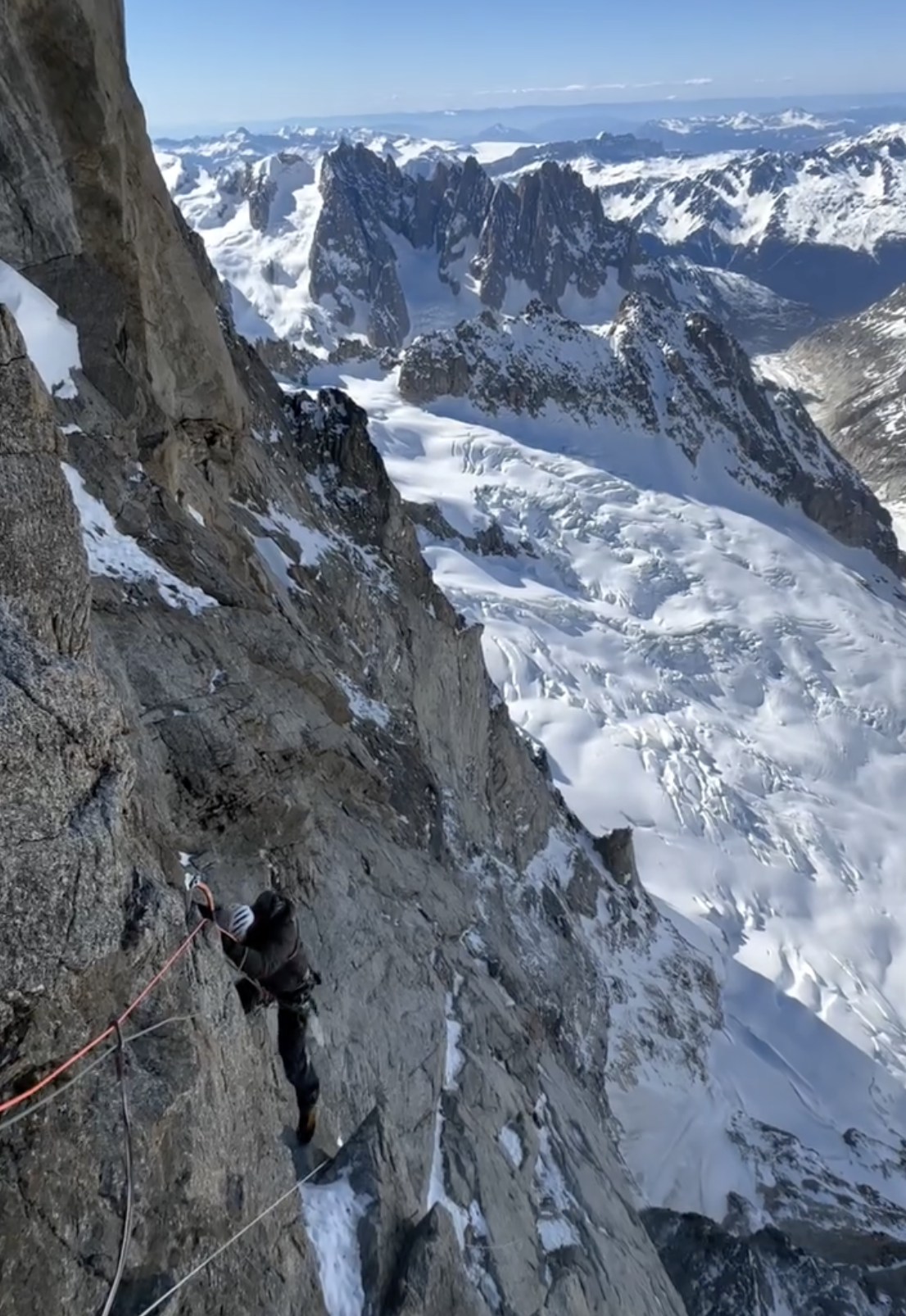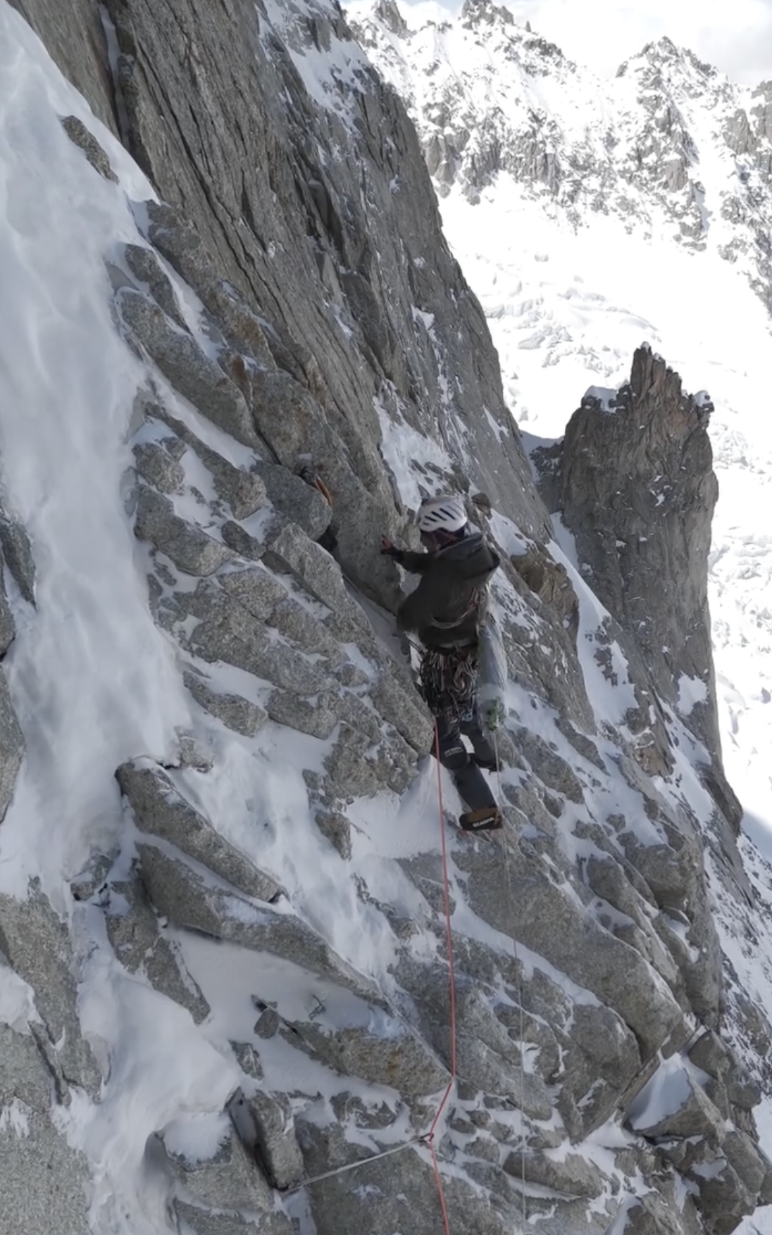La cordata francese ha mostrato una confidenza incredibile non solo nella tecnica pura, ma anche nell'interpretare una linea complessa, in un ambiente severo. Louna Ladevant e Mathieu Maynadier hanno portato a termine una salita davvero da applausi: maestri con le picche in mano, hanno dato dimostrazione delle loro capacità: si tratta infatti della prima on-sight, della Directe de l'amitié (ED+, 1.100 m, M9+), una delle vie più iconiche delle Grandes Jorasses. Per la discesa, la cordata ha optato per la soluzione più “rapida”. Estratti i rispettivi parapendio dalle proprie sacche, hanno dispiegato le vele e si sono lanciati in volo. A quanto pare le condizioni non erano però delle migliori e si sono dovuti sbrigare, tanto da non fare nemmeno a tempo a togliersi il materiale d'arrampicata di dosso. U