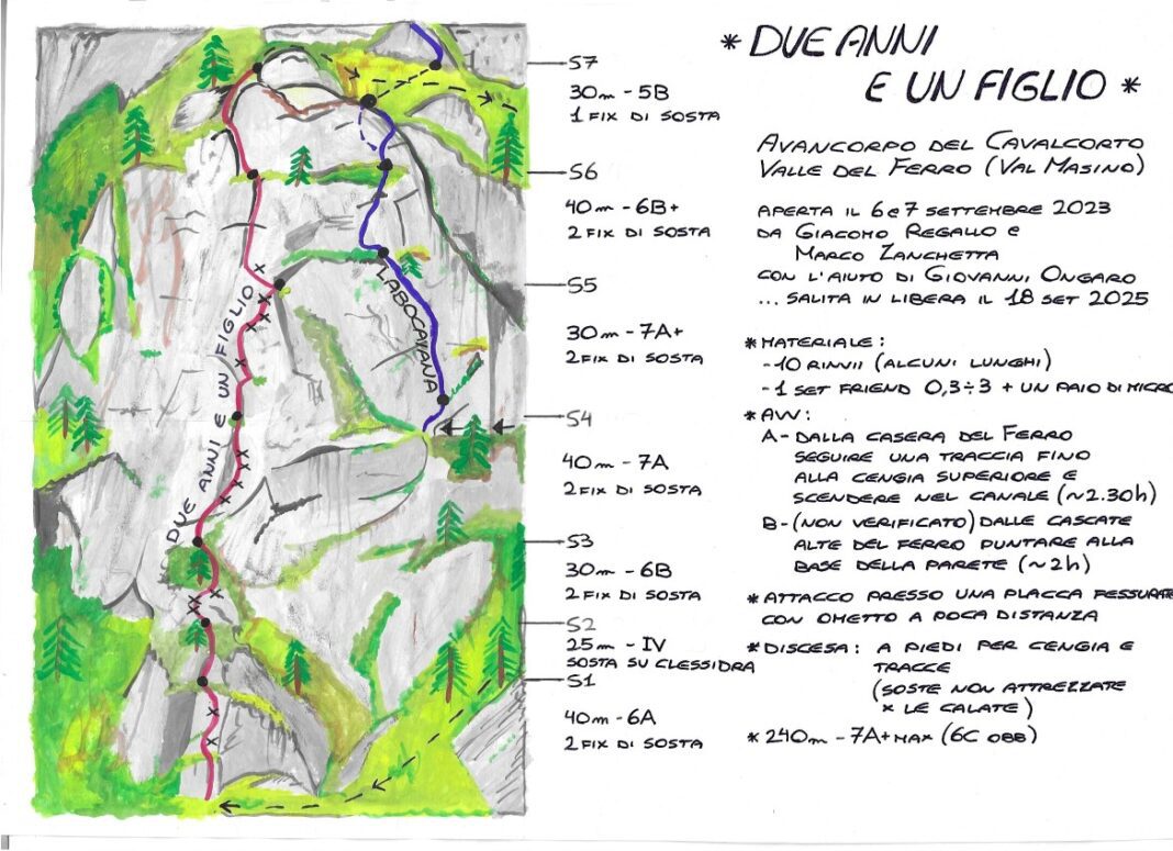 Il 6 e 7 settembre 2023, dal basso, nasceva così una nuova linea di 240 metri sul granito del Cavalcorto, una parete che guarda verso il Monte Disgrazia. Ma la libera sarebbe arrivata molto più tardi: il 18 settembre 2025, due anni dopo, complici piogge frequenti, impegni professionali e la nascita del figlio di Regallo, a cui è dedicata la via.