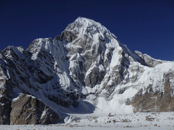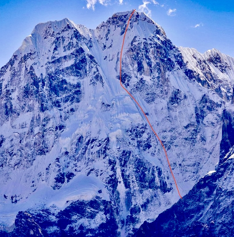 Il Pholesobi Peak, con la linea salita © H. TaneishiSempre nella regione del Kangchenjunga, un'altra cordata giapponese, formata da Hidesuke Taneishi e Hiroki Yamamoto, ha effettuato la prima salita del Pholesobi Peak di 6.652 metri. Hanno scalato una via diretta sulla parete nord, alta ben 1.400 metri. I due scalatori avevano tentato per la prima volta l'itinerario un anno fa, ma avevano dovuto abortire il tentativo per problemi di salute.
