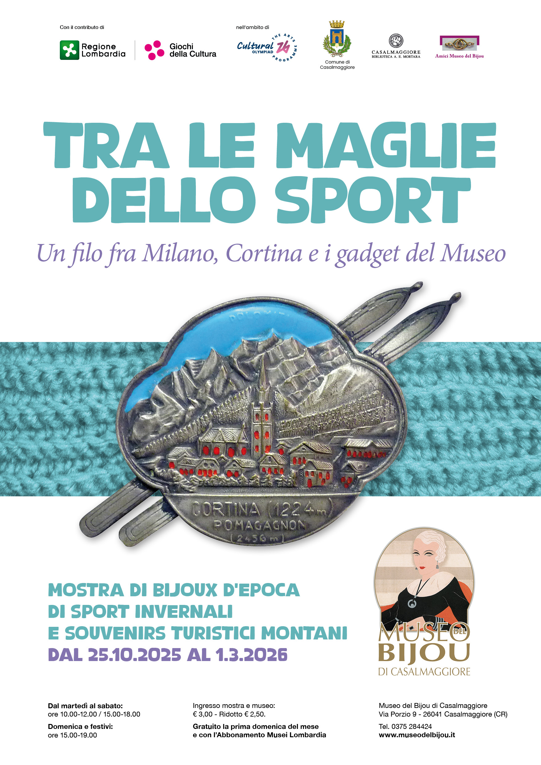 Un viaggio tra storia, sport e creatività quello proposto dal Museo del Bijou con l’inaugurazione della mostra “Tra le maglie dello sport. Un filo tra Milano, Cortina e i gadget del museo”, avvenuta sabato 25 ottobre. L’esposizione, che resterà aperta fino al 1° marzo 2026 nella Sala Zaffanella, rientra tra le iniziative promosse da Regione Lombardia per celebrare i Giochi olimpici invernali Milano Cortina 2026.