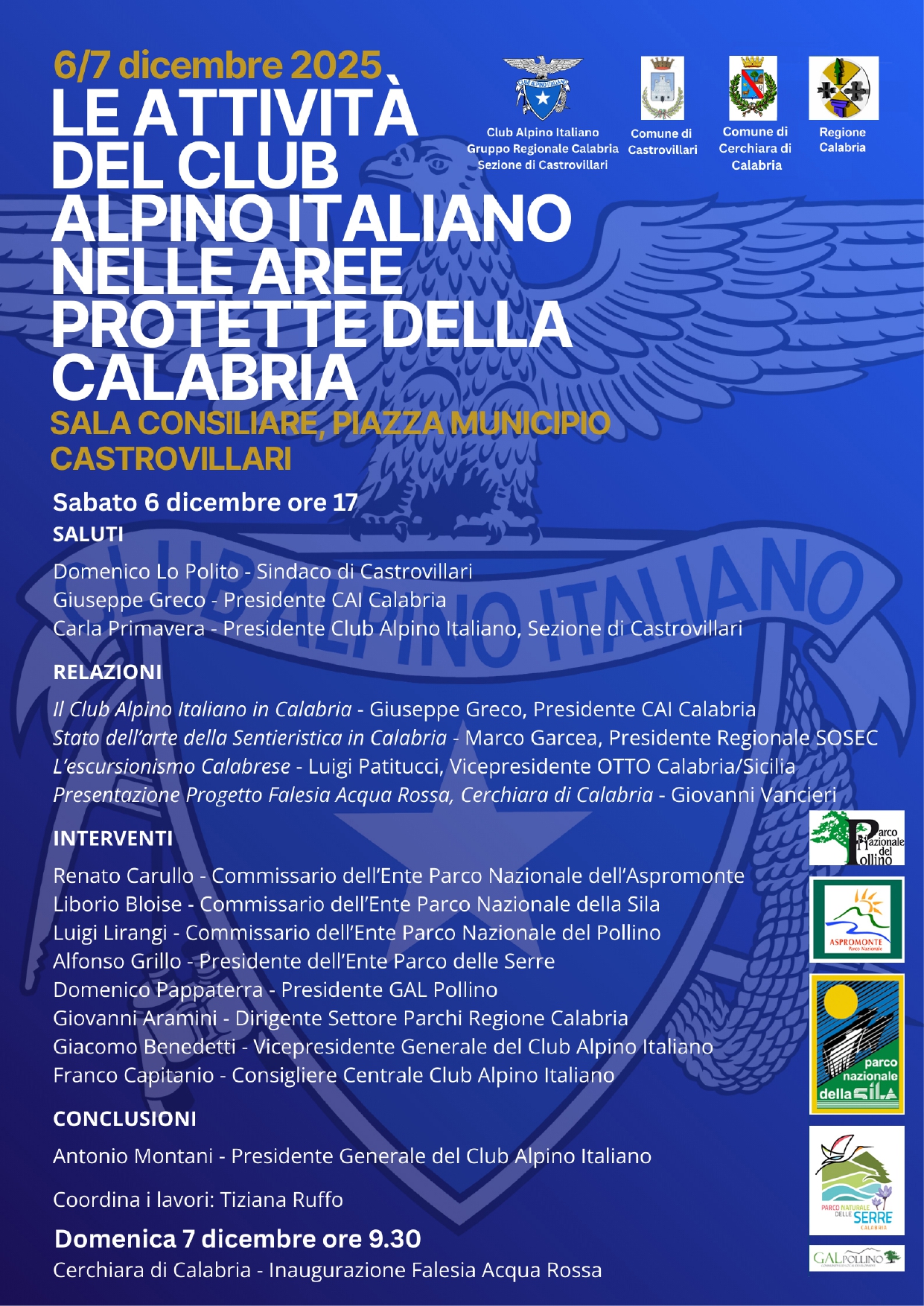 Il programma dell'eventoCastrovillari si prepara ad accogliere il mondo dell’escursionismo calabrese. Il 6 e 7 dicembre 2025 la cittadina del Pollino ospiterà l’iniziativa “Le attività del Club Alpino Italiano nelle aree protette della Calabria”, un appuntamento promosso dalla Sezione CAI di Castrovillari insieme al Gruppo Regionale Calabria, con il supporto degli enti locali e dei parchi nazionali.