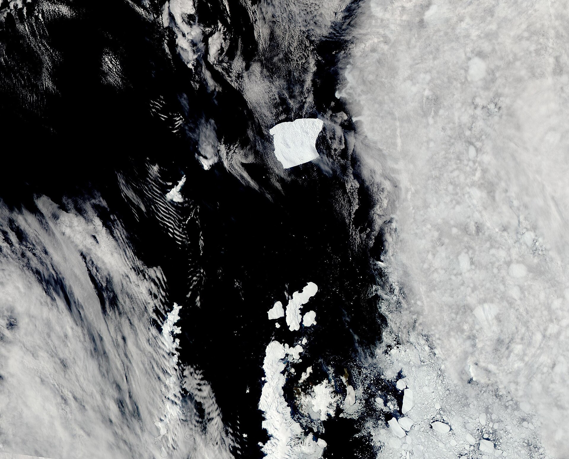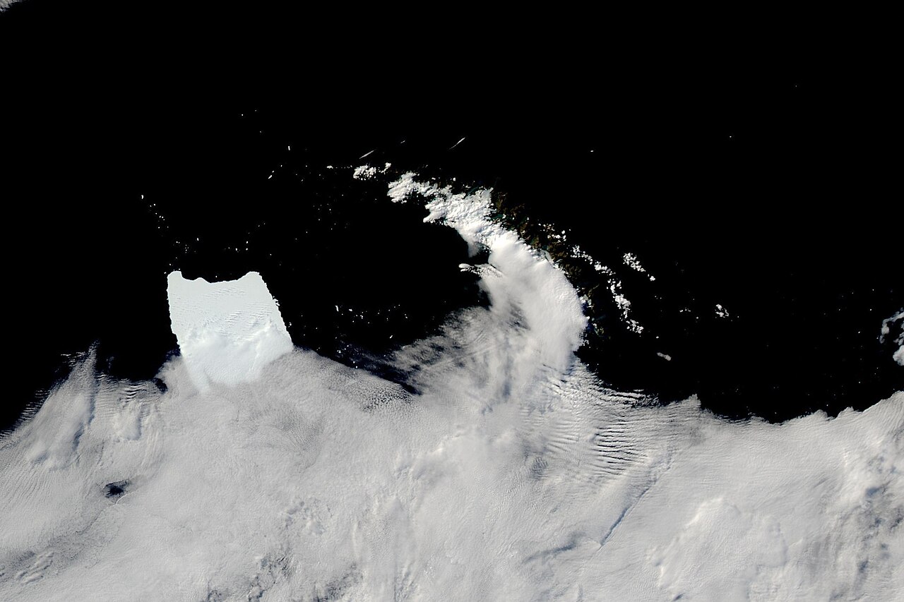 A-23A nel dicembre 2023 - Foto By MODIS Land Rapid Response Team, NASA GSFC - This image or video was catalogued by Goddard Space Flight Center of the United States National Aeronautics and Space Administration (NASA) under Photo ID: 2023-12-24 -Wikimedia Commons, Public Domain