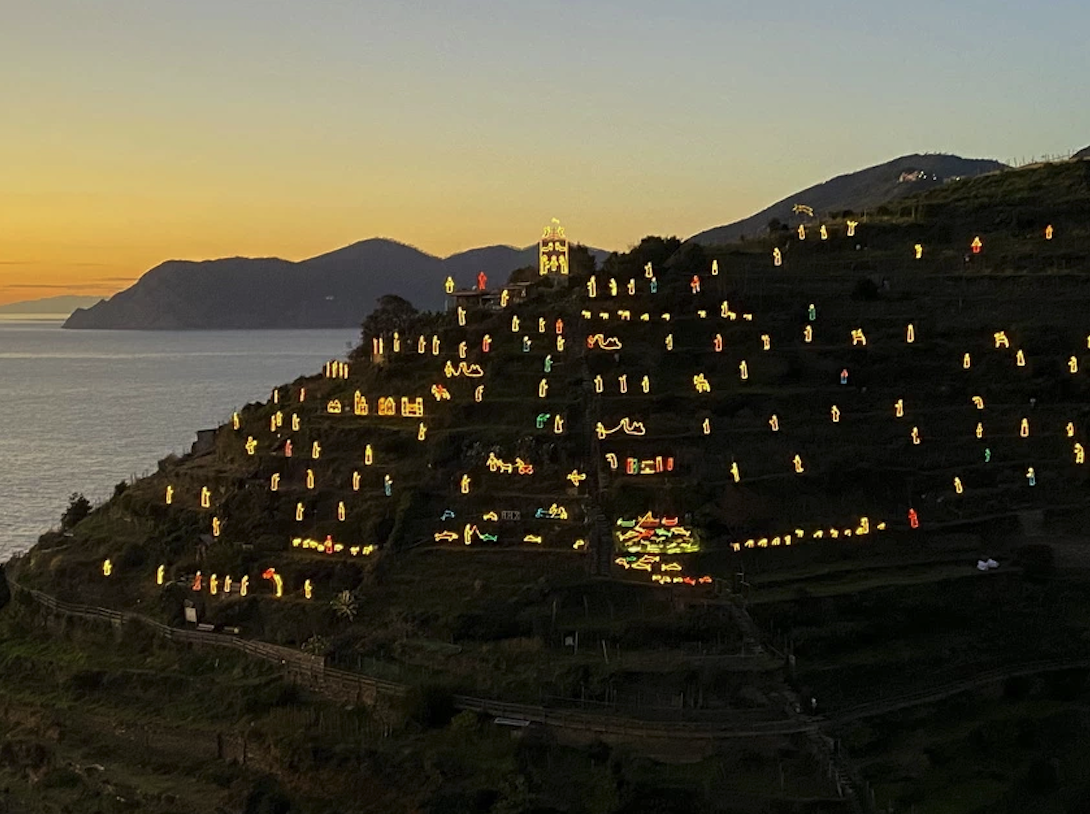 Poi la luce. La Stella Cometa si accende per prima, seguita dalle sagome che rischiarano l’intero versante. È un istante che suscita stupore autentico, perché ogni volta sembra nuovo. In quell’attimo, il presepe diventa racconto visivo di tanti elementi e valori che si riflettono nell’identità stessa delle Cinque Terre.