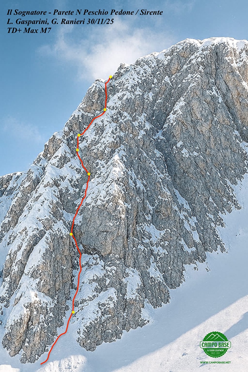I 7 tiri de Il sognatore @L. Gasparini, G. RanieriL'inizio della stagione invernale - intesa come condizioni meteo e non come calendario- quest'anno è stato generoso di neve tanto sulle Alpi quanto in Appennino, solleticando l'appetito degli alpinisti. Luca Gasparini e Gianluigi Ranieri ne hanno approfittato per aprire una nuova via sul Sirente, dove hanno tracciato Il sognatore, un itinerario di 280 metri, con difficoltà valutate in TD+, M7 massimo, sulla parete nord del Peschio Pedone.
