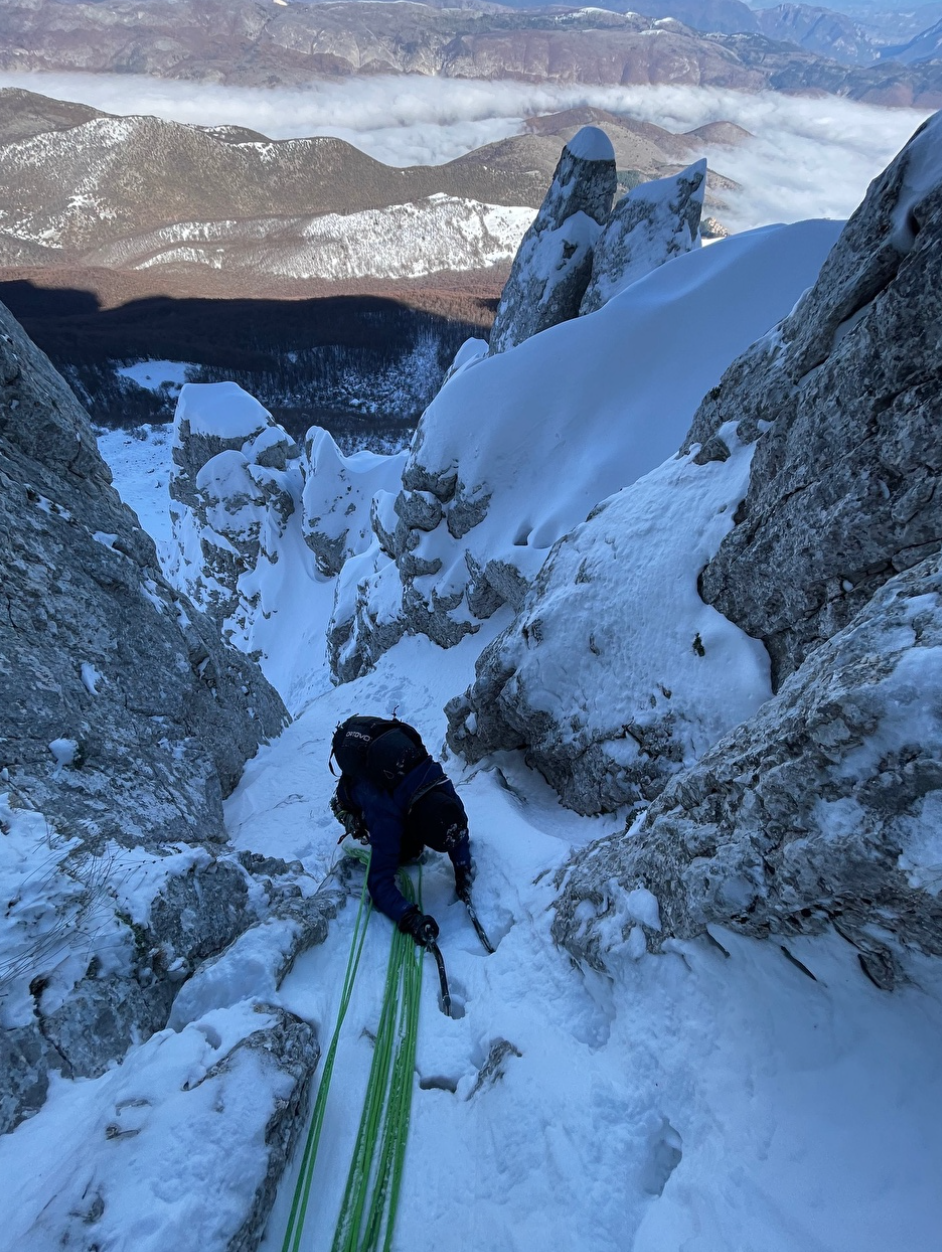 Luca è particolarmente contento della buona riuscita della puntata in una zona meno battuta rispetto ad altre più gettonate dell'appennino abruzzese. “Il Gran Sasso è difficile da raggiungere con la chiusura della strada, così siamo andati a fare un giro nel Sirente, che regala sempre un'atmosfera di avventura – spiega Gasparini-. Guardando vecchi album di vie, ho notato questo canalino, che con un po' di immaginazione e altrettanta fortuna sarebbe potuto diventare una via”.