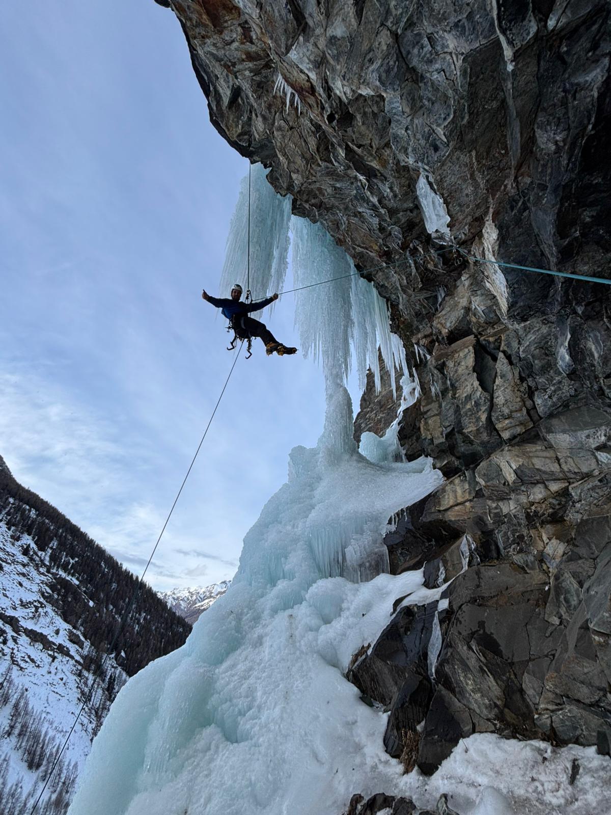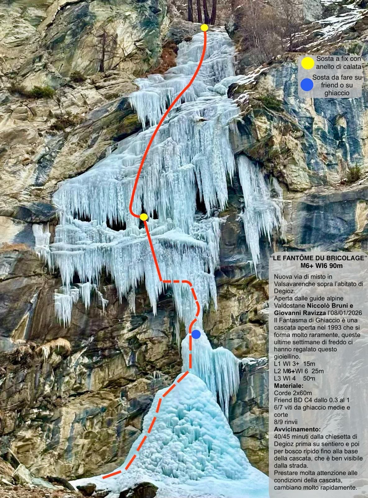 A inaugurare il 2026, era l'8 gennaio, è stata Le fantome du bricolage (M6+, WI6, 90 metri), che la guida alpina di Torino ha aperto proprio con Bruni, sopra l'abitato di Degioz. Si tratta di una variante dry di una cascata che ormai si forma raramente: Il Fantasma del ghiaccio, anno 1993. I due per salire hanno sfruttato le frange sulla destra e sono riusciti a ricavare una bella linea. “La cascata spesso non è scalabile, per via dell'esposizione al sole. A ogni modo, dietro la colonna c'è un tiro molto bello e siamo riusciti a tirare fuori una lunghezza ottima, di 25 metri, piuttosto strapiombante. Due o tre cordate sono riuscite ad andare a ripeterla”.