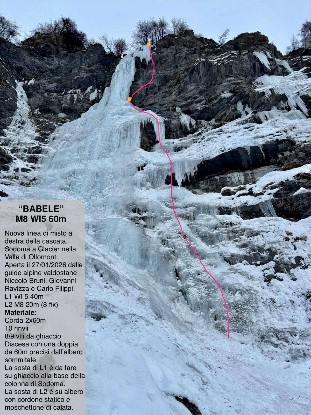 A fine gennaio è stata la volta di Babele, che sale a destra di Sodoma, a Ollomont. La via corre su una frangia indipendente rispetto al ben noto itinerario della “valle fredda”. “Il primo tiro è bello lunghetto e dopo due belle sezioni di ghiaccio va a fare sosta dietro alla candela. Da lì prende lo strapiombo ed è un bell'M8. Quel giorno eravamo in tre, c'era anche Carlo Filippi”. Nonostante l'ampia frequentazione del settore, nessuno ci aveva ancora messo mano. “Ci vuole occhio e la roccia non sempre è proteggibile, ma la linea che è venuta fuori merita. Lì c'erano già Sodoma e Gomorra, mancava solo la Torre di Babele...ma speriamo che non venga giù”. Con l'aggiunta di questa linea, per chi ha fisico e tecnica c'è la possibilità di farla giornata abbinandola con Sodoma o altro e pare che la frequentazione in queste due settimane non sia mancata.