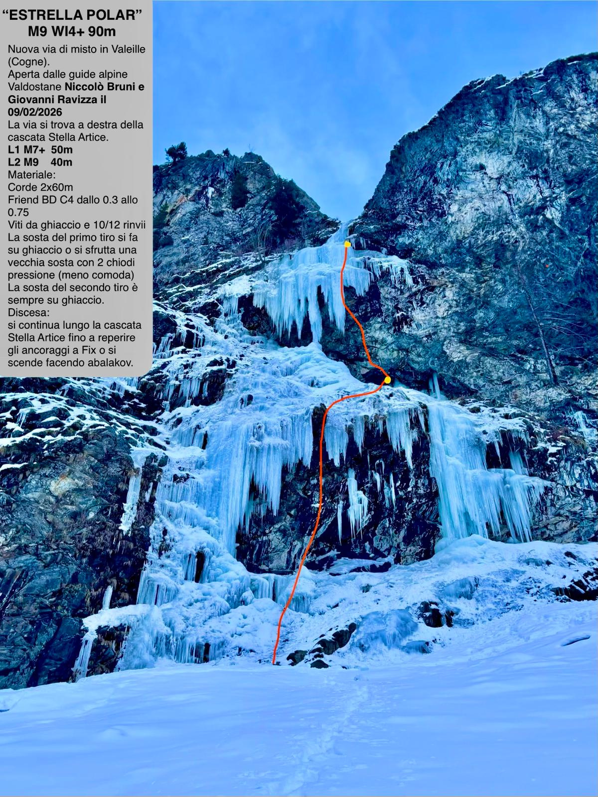 Infine, la settimana scorsa è stata la volta di Estrella polar, a Cogne. Ravizza e Bruni sono andati a Stella Artice e sono riusciti a ricavare una nuova linea a destra della cascata: due tiri per un totale di ben 90 metri, con difficoltà fino a M9. “Il primo tiro può essere M7 o M7+ e poi si va a destra della candela classica per la seconda lunghezza. È stato bello perché in giornata siamo riusciti a fare tutto: ad aprirla e a liberarla entrambi. Infine abbiamo trovato anche un nome in linea con Stella Artice, che è la storpiatura di una famosa birra”. Estrella Polar purtroppo non è già più in condizioni: come si è formata, così ha salutato la compagnia dopo appena una o due ripetizione. Ma è una bella idea da segnarsi per il futuro, quando possibile.