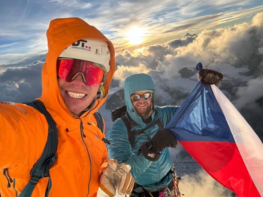 I due alpinisti in vetta © Jakub Vlček e Marek DismanIl Tengi Ragi Tau ha una storia alpinistica piuttosto recente: tra le ascensioni da ricordare, nel 2019 Marc Toralles, Roger Cararach e Alberto Santiago realizzarono la prima ripetizione in stile alpino del pilastro sud della punta est del massiccio (6660 m). In quell’occasione, i tre avrebbero voluto tentare la parete ovest, allora vergine, ma lì si trovavano anche Alan Rousseau e Tino Villanueva. I due avevano già provato ad aprire una via sulla parete per i due anni precedenti, e finalmente nel 2019 erano riusciti nell’impresa. La via Release the Kraken (1600 m, AI5, M5+) era valsa a Rousseau e Villanueva addirittura un Piolet d’Or.