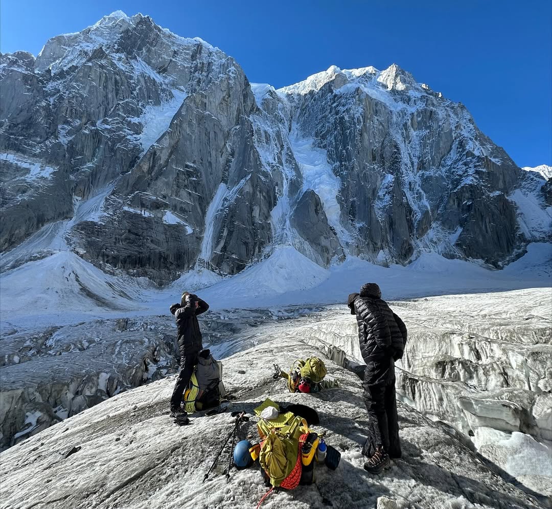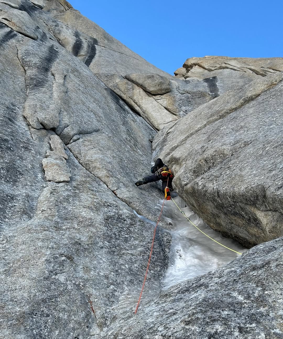Il 23 settembre hanno raggiunto la vetta, a circa 6082 metri, dopo tre giorni di scalata e due bivacchi in parete. La via, circa 500 metri di sviluppo, alterna passaggi di ghiaccio e roccia con difficoltà fino a M6 e A2+. “Abbiamo trovato un’arrampicata varia e bellissima, dalle fessure ripide e soleggiate al misto tecnico, fino ai camini ghiacciati in cui usavamo contemporaneamente piccozze e scarpette” racconta Steadman.