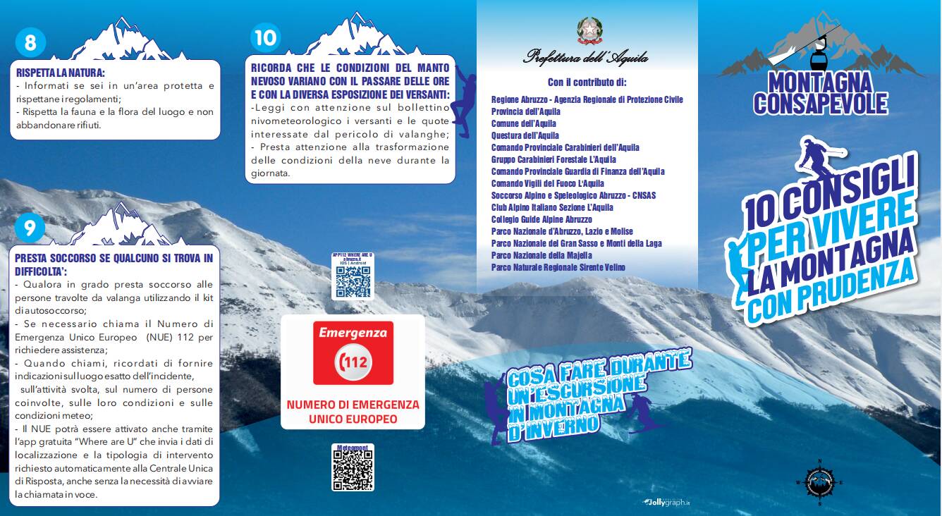 Una pagina del vademecumQualche giorno fa, presso la Prefettura dell'Aquila, il Prefetto Giancarlo Di Vincenzo ha presentato un opuscolo informativo destinato a sensibilizzare i cittadini riguardo la sicurezza in montagna durante la stagione invernale. Il documento, pensato per fornire consigli pratici e linee guida sulle corrette norme di comportamento da adottare durante le escursioni invernali, sarà distribuito in luoghi di alta frequentazione, come rifugi, stazioni sciistiche e punti di accesso alle montagne aquilane.