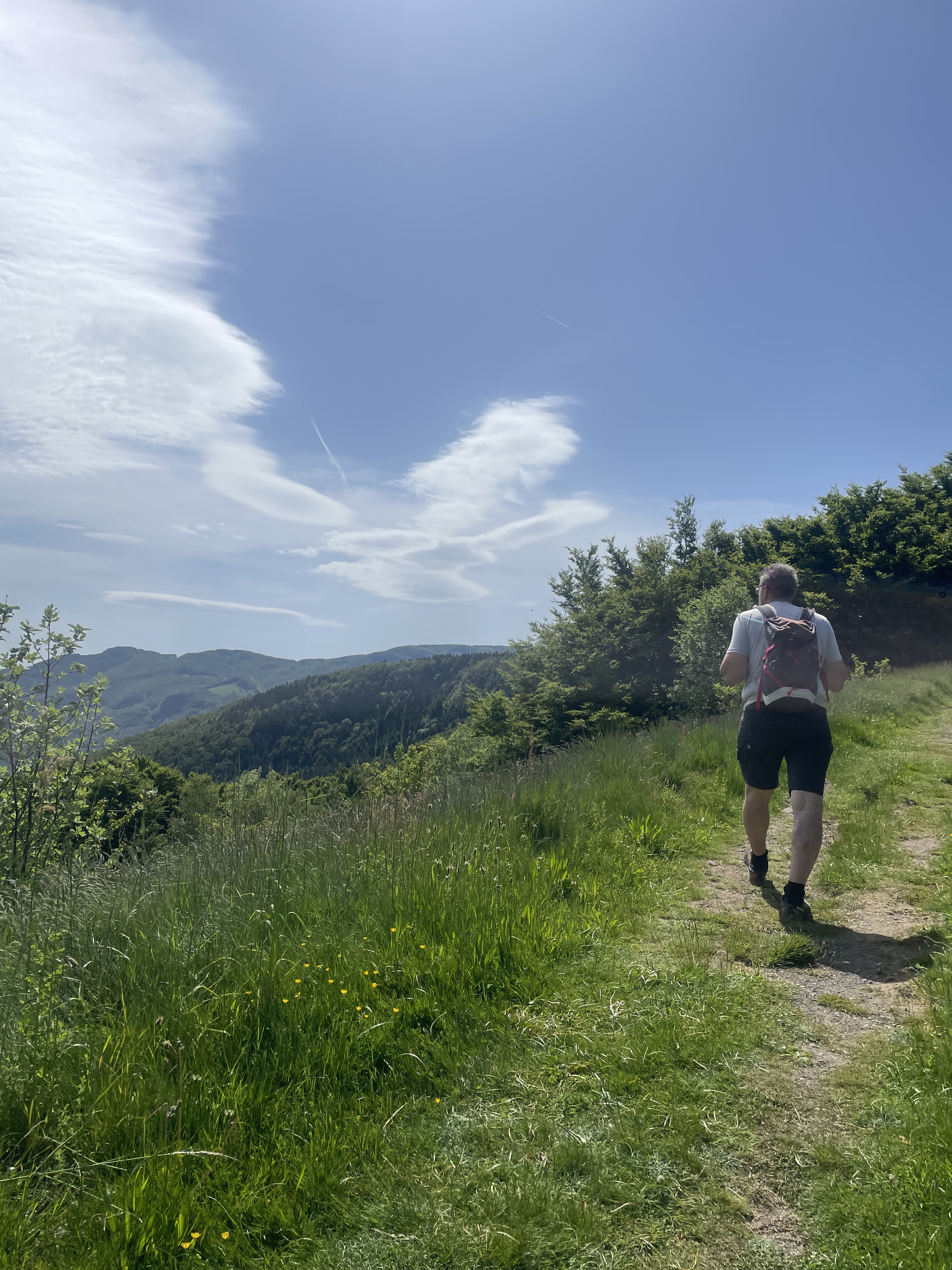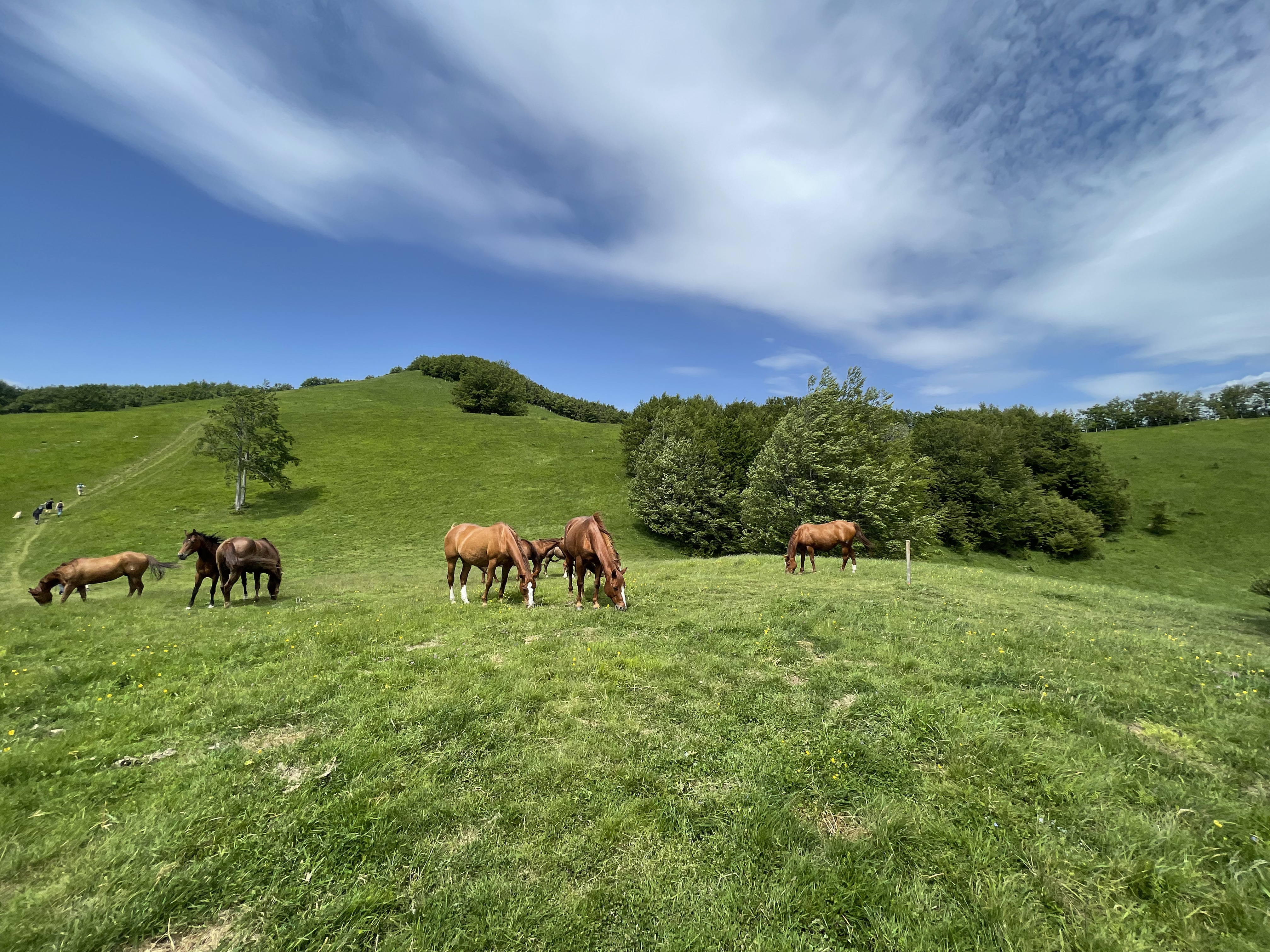 Dalla chiesa proseguiamo lungo il sentiero 00 in un’ascesa quasi continua, prima nel bosco poi nel bel mezzo di prati (Prati e Bocchetta del Tavola – 1466 m. slm), accompagnati dal galoppo libero dei cavalli al pascolo. È stata forse la prima volta, se ce ne sono state altre il ricordo è ormai sbiadito nel tempo, in cui ho visto galoppare un cavallo senza alcun cavaliere in groppa impegnato a spronarlo. È stata un’immagine polarizzante: più il cavallo prendeva velocità più mi immobilizzavo, colpito da tanta eleganza e fierezza, consapevole, forse per davvero, di quanta bellezza struggente conviva negli animali, anche quelli a cui la nostra vista è più abituata. E poi, subito dopo ho ripensato a quando, improvviso e folgorante, abbiamo visto sbucare dal fitto del bosco un cervo al galoppo; la sua traiettoria, perpendicolare alla nostra, ha intercettato il sentiero pochi metri più avanti, non molti meno di dieci. Vederlo comparire, rapidissimo nonostante la mole, balzare nella strada con un solo salto e scomparire con un secondo senza curarsi di noi, è stato un momento talmente appagante e al contempo così emozionante da lasciarci immobili per più di qualche momento. Solo dopo attimi di assoluto silenzio sono partiti gli inevitabili "hai visto?", "stupendo", "ma che salto ha fatto?" e così via fino a quando le emozioni più forti sono scemate e il controllo sui pensieri ha ripreso il sopravvento.