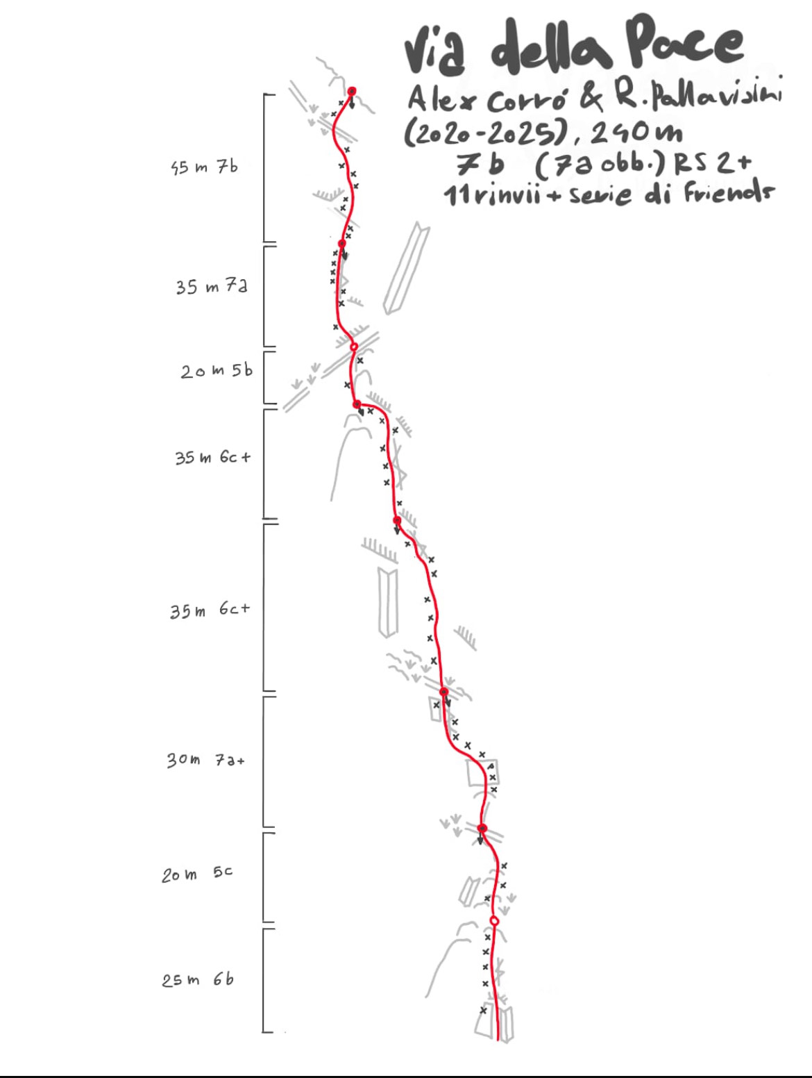Corrò ha voluto che la sua nuova via non fosse soltanto un gesto alpinistico, ma anche un messaggio. In un momento storico in cui la parola “pace” sembra smarrita, ha scelto di usare il linguaggio che gli è più familiare - quello della roccia - per esprimere un pensiero semplice ma universale. Una scelta che nasce dal desiderio di condividere un valore e che trova la sua forma più autentica nel nome stesso della via. “Tendo a essere abbastanza riservato riguardo ai miei pensieri, ma negli ultimi anni ho iniziato a espormi maggiormente. Ho pensato che dare il nome alla via fosse la misura giusta. Si chiama 'La via della pace' e non è un nome scelto a caso: è dedicato a una parola che oggi sembra dimenticata, guardando a ciò che accade nel mondo. Si tratta di un piccolo gesto, una traccia lasciata sulla roccia, per ricordarci che la pace è ancora possibile e necessaria. Che la montagna continui a insegnarci silenzio, rispetto e armonia".