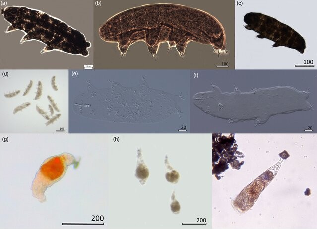Tardigradi (a–f) e Rotiferi (g–i) dei ghiacciai. Foto K. Zawierucha et al (2020).