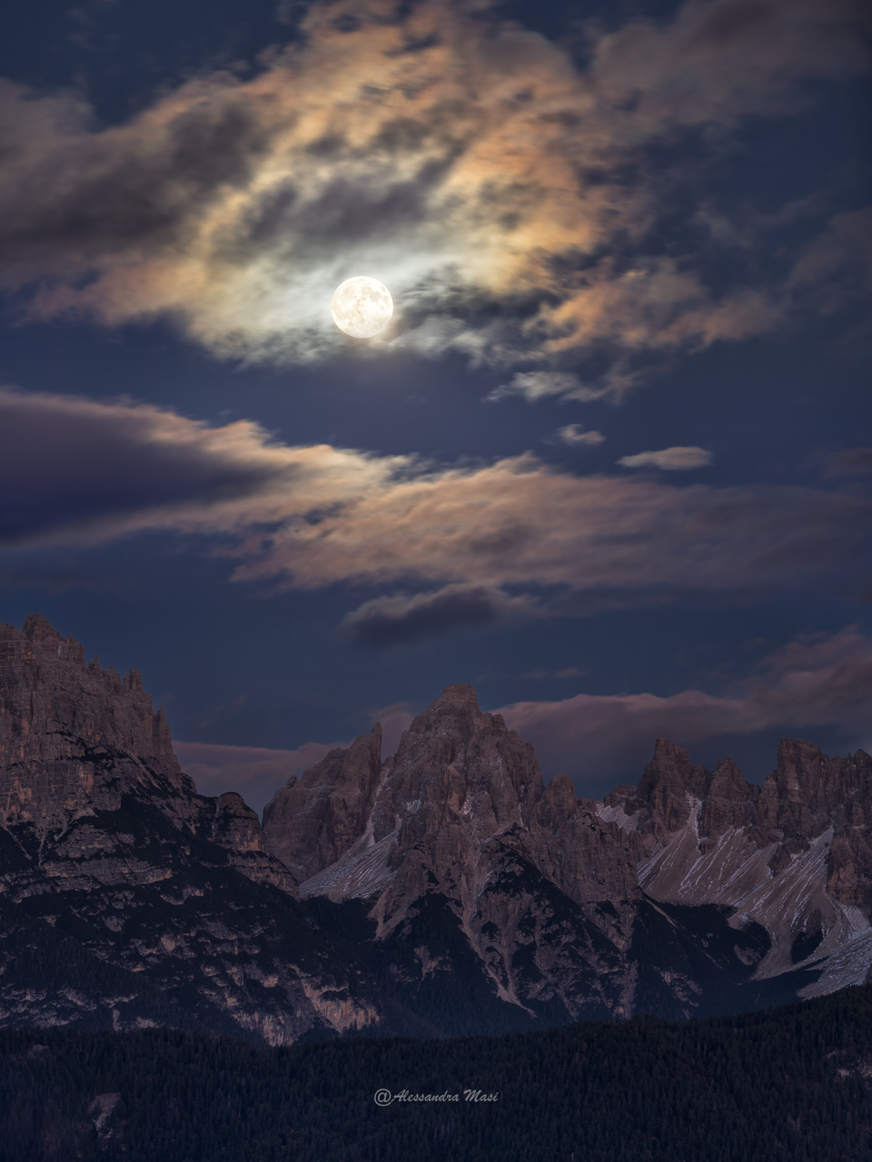 Nell’immagine in primo piano emergono alcune delle cime più emblematiche della zona: Croda Longa, Cridola, Torre Valentino, Crodon di Giaf, Monfalcon di Cimoliana e Punta Koegel. Secondo le parole della fotografa, “nonostante il cielo nuvoloso, lo spettacolo è stato sorprendente: proprio le nubi hanno dato origine a delicate iridescenze attorno alla Luna”, rendendo unica l’armonia tra luci e ombre.