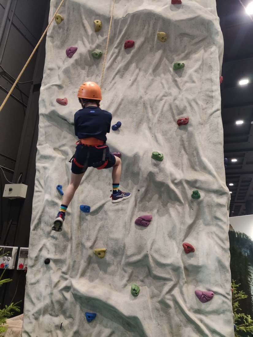 Uno dei tanti bambini che ha provato ad arrampicare sulla parete dello stand © CaiSu e giù sulla parete di arrampicata