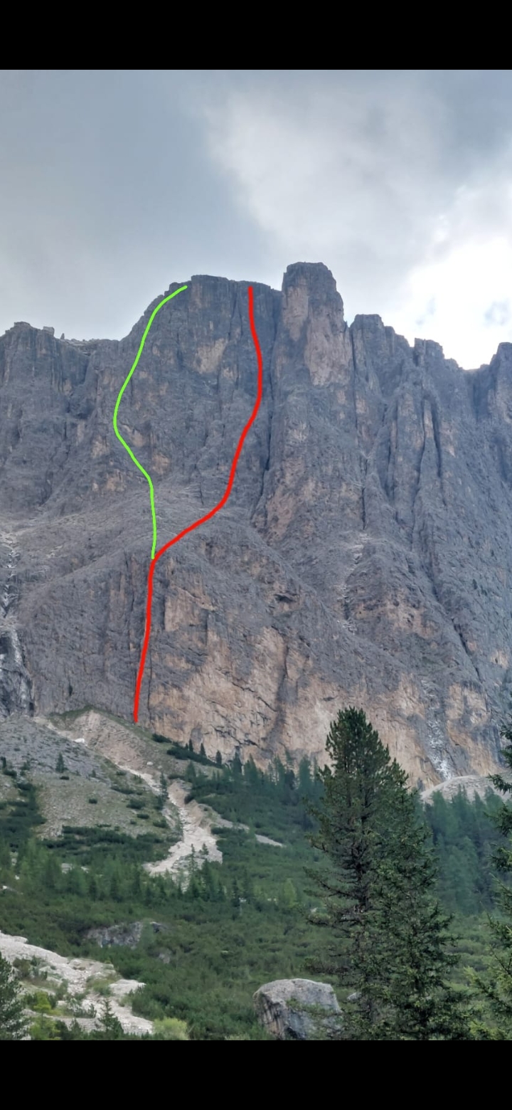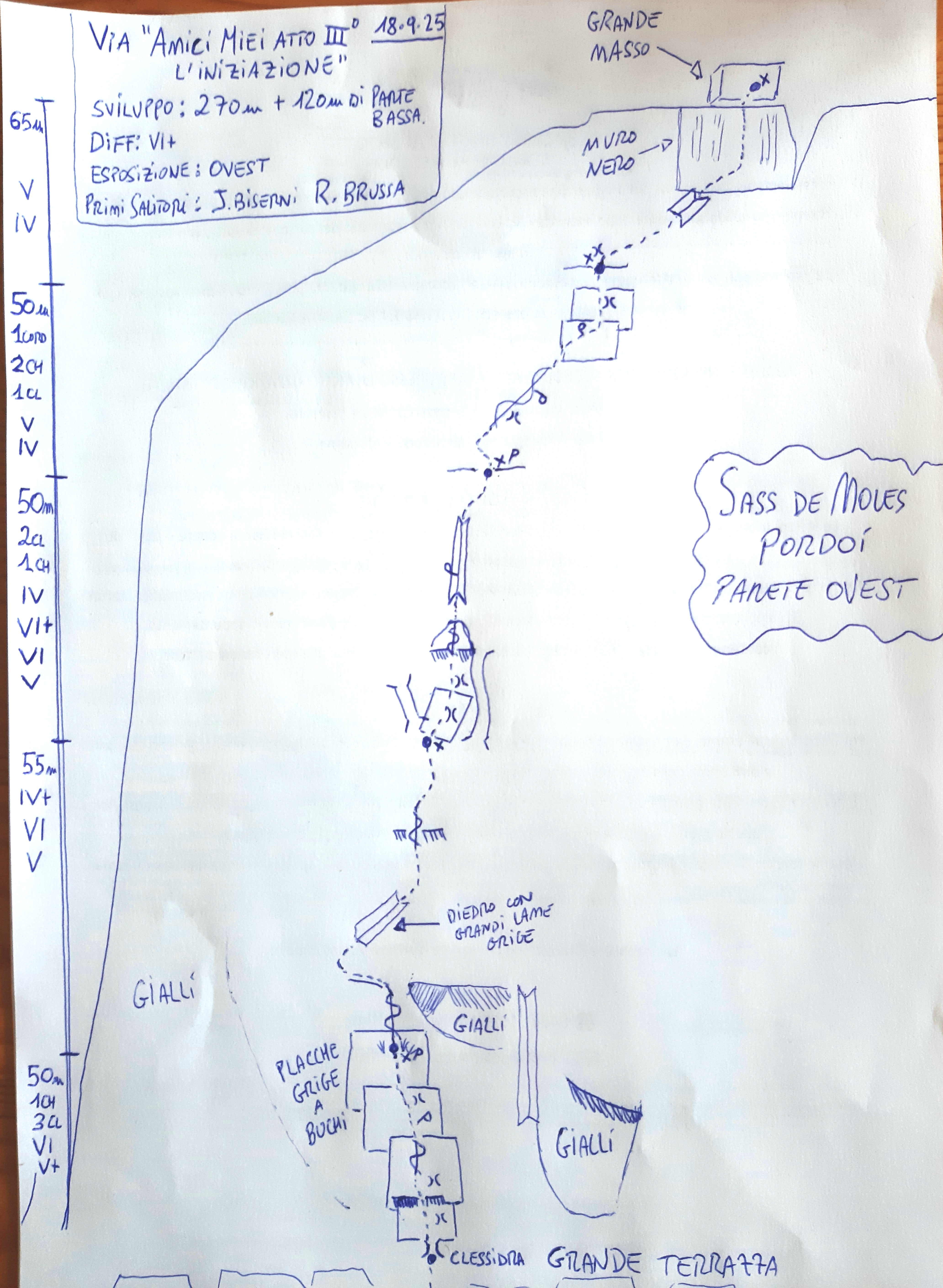 L’itinerario parte condividendo i primi quattro tiri con gli atti I e II di “Amici miei”, per poi deviare verso sinistra su una evidente placca grigia che risale tra fasce gialle fino allo spigolo settentrionale. La salita è stata attrezzata con quattro chiodi di passaggio, soste con spit, clessidre e friend, garantendo sicurezza pur mantenendo lo spirito avventuroso della montagna.