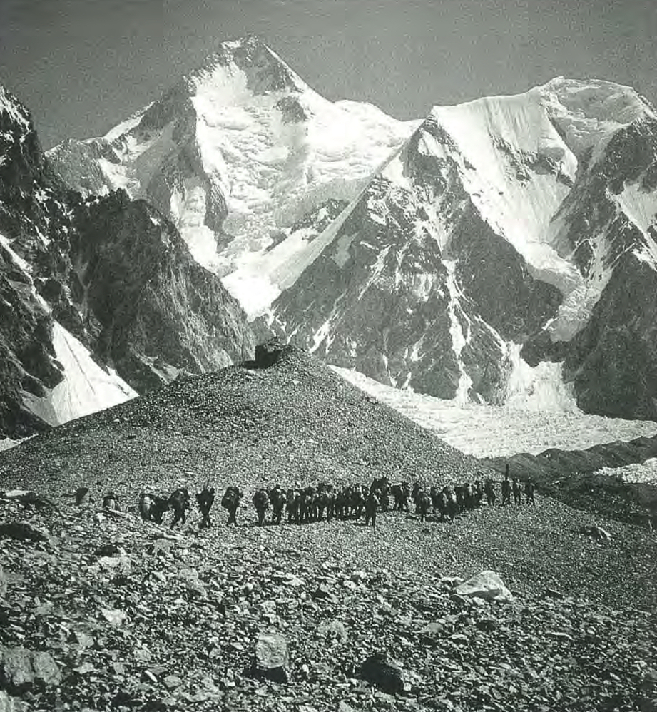La spedizione in marcia. Sullo sfondo il G1 © Annuario CAI BergamoZanotti entra nel merito della questione delineata da Ferrante. "Quest'anno eravamo veramente in tanti. Anzi eravamo in troppi. Con esattezza non so, ma credo che nel periodo in cui queste scalate sono possibili, in zona vi siano state non meno di cinquanta spedizioni, alle quali si aggiungono i gruppi dei "trekking". Io credo che nel complesso vi siano state non meno di mille persone. E tutte negli stessi posti. Se a questa circostanza si aggiunge che moltissimi mantengono anche in montagna lo stesso comportamento che usano in città o in campagna, lasciando i rifiuti dove capita, e sbarazzandosi degli oggetti non più necessari dove è più comodo, si comprenderà facilmente come il degrado naturalistico e l'inquinamento abbiamo ormai raggiunto dimensioni vistose ed assurde (...). Ho visto con i miei occhi - racconta ancora Zanotti - sacchi di plastica accostati l'uno all'altro, sci e tende parzialmente bruciate perché non più utilizzabili, decine di lattine di birra e coca-cola buttate qua e là, chili di cibo disseminati nella neve o sul ghiaccio, materiali vari accatastati alla bell'e meglio in attesa non si sa di chi".