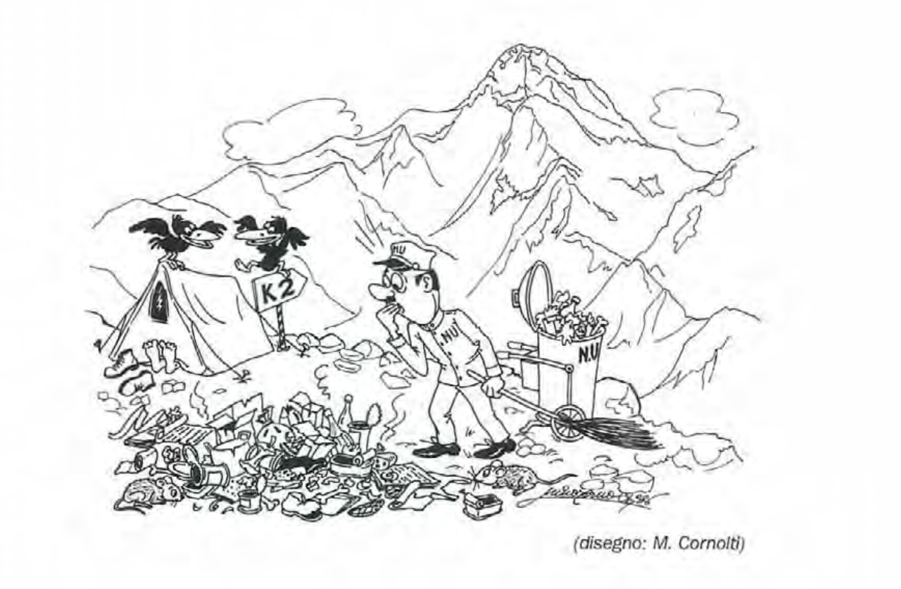 Una vignetta che dipinge la situazione ai campi base © M. Cornolti (annuario CAI Bergamo)Il problema dell'overtourism - anche in Himalaya- è di grande attualità, in cima alle agende dei siti d'informazione specializzati e non. Ma non è una novità, suggerendo il fatto che talvolta gli argomenti, le problematiche, sono solo parcheggiati lì, in attesa di essere ciclicamente trattati. Prova ne è un reportage di grandissimo valore, pubblicato sull'annuario 1985 del CAI di Bergamo.