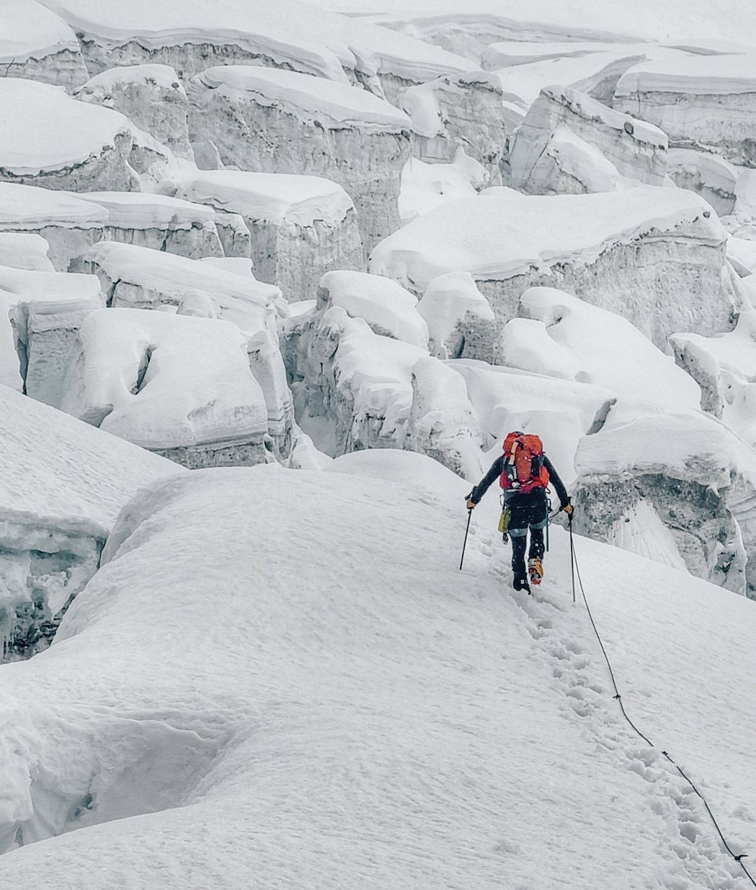 La cordata in mezzo ai crepacci © A. BieleckiLe condizioni non erano assolutamente adeguate e Rousseau ha iniziato a patire intensamente il freddo, senza riuscire a chiudere occhio. Al mattino la situazione era migliore, la visibilità aumentata. Bielecki e Rousseau si sono accorti che la parete non era lontana. «Superare l'ultima fascia di crepacci ha funzionato meglio dell'espresso mattutino e ha alzato il nostro livello di adrenalina».