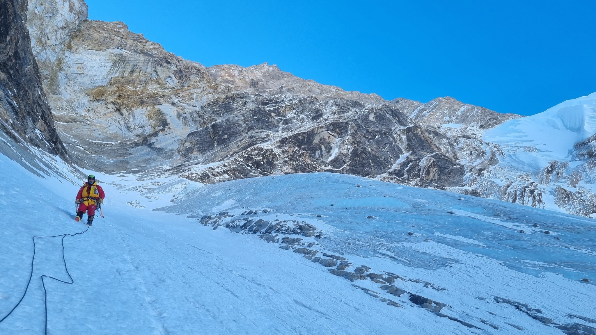 Alle 9 del mattino i due erano ai piedi della parete, a una quota di circa 5.200 metri. Bielecki e Rousseau hanno iniziato a salire il couloir in simul e sono riusciti a progredire di circa 800 metri. «Quando mancava un'ora e mezza al tramonto abbiamo iniziato a cercare un terrazzo per bivaccare, sembrava esserci qualcosa a qualche decina di metri più in alto, ma la realtà si è poi rivelata diversa». I due hanno passato una seconda notte difficile, appesi agli imbraghi. Al mattino la situazione non era ideale. «C'era nuvoloso e ha nevicato tutto il giorno, quindi abbiamo avuto finalmente una notte con cielo stellato». La loro sorpresa perciò è stata grande, quando alle 4 del mattino hanno iniziato a subire delle scariche che hanno proseguito fino alle 8. A quel punto la cordata si è disunita negli intenti. «Purtroppo, in questa fase, il mio socio si è rifiutato di collaborare e ha deciso fermamente di ritirarsi. Era equipaggiato troppo leggero per le temperature (circa -20°C al mattino) e troppo stanco, dopo due notti insonni, per continuare a salire. Una decina di discussioni più tardi, ci siamo fermati alla base del muro per raggiungere il campo base sani e salvi la sera dello stesso giorno».
