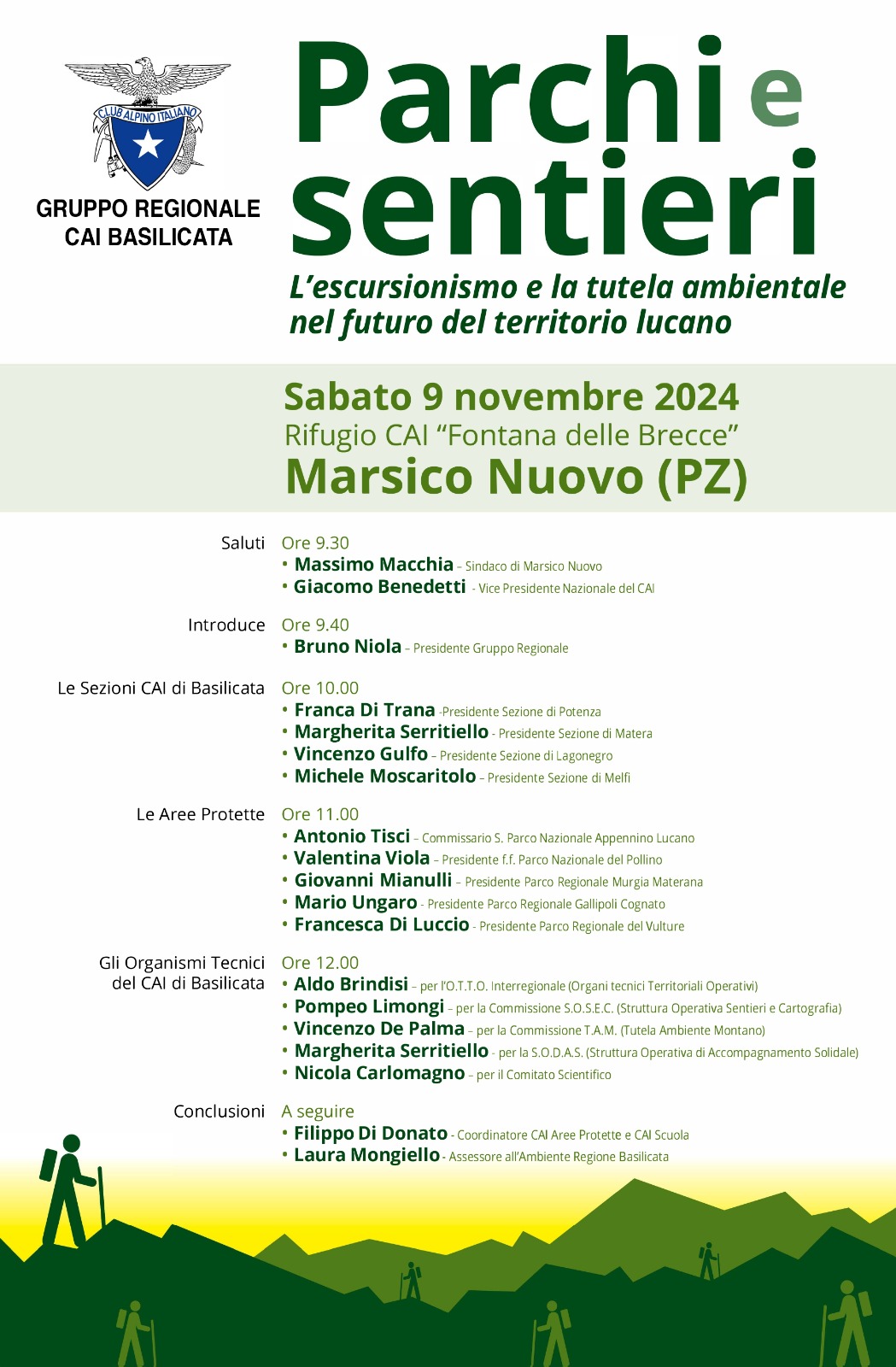 “Parchi e sentieri: l’escursionismo e la tutela ambientale nel futuro del territorio lucano” è il titolo del Convegno in programma sabato 9 novembre 2024, alle ore 9.30 al Rifugio Fontana della Brecce a Marsico Nuovo, nel Parco Nazionale dell’Appennino Lucano Val d’Agri – Lagonegrese. L’organizzazione è a cura dal Gruppo Regionale del Club Alpino Italiano (Cai) della Basilicata.