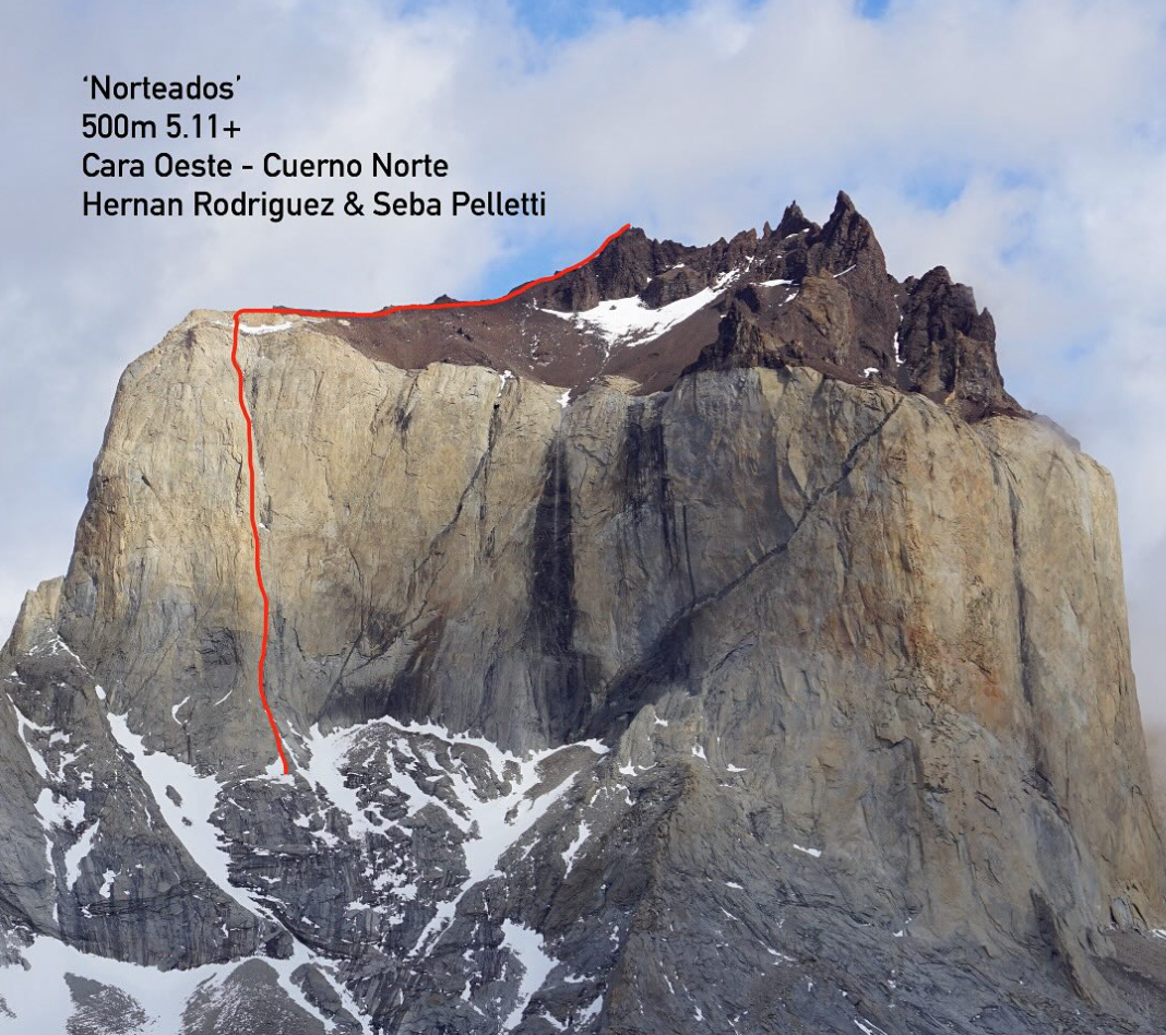 La nuova via è stata battezzata Norteado e - nei suoi 500 metri di sviluppo- supera difficoltà che sfiorano il 7a. Attacca per un sistema di placche e prosegue per fessure e diedri, seguendo una linea sempre molto logica. Il commento di Pelletti su Instagram evidenzia come la via fosse ben stampata in mente ai due alpinisti già da un po', ma anche di come la salita sia avvenuta in un clima caratterizzato da una certa improvvisazione per via di una finestra meteo in esaurimento. La scalata è avvenuta infatti il 10 novembre, solo pochi giorni prima della tragedia che ha funestato il parco naturale, con la tormenta che ha causato la morte di cinque escursionisti nella zona del John Garner Pass.