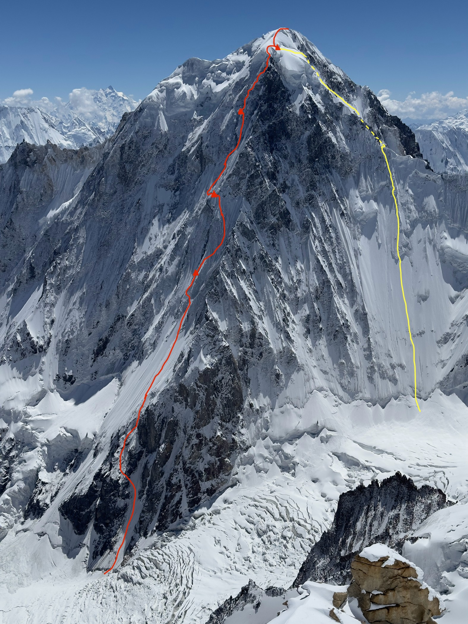 Il trio ha operato nel remoto Ghiacciaio Yashkuk Yaz, ai confini con l’Afghanistan, in una zona raramente visitata. Dopo un’intensa fase di acclimatazione e due bivacchi tra i 5600 e i 5900 metri, gli alpinisti hanno completato la salita tra il 19 e il 23 settembre 2024. La discesa, complessa e lunga, ha richiesto numerose calate su terreno misto.