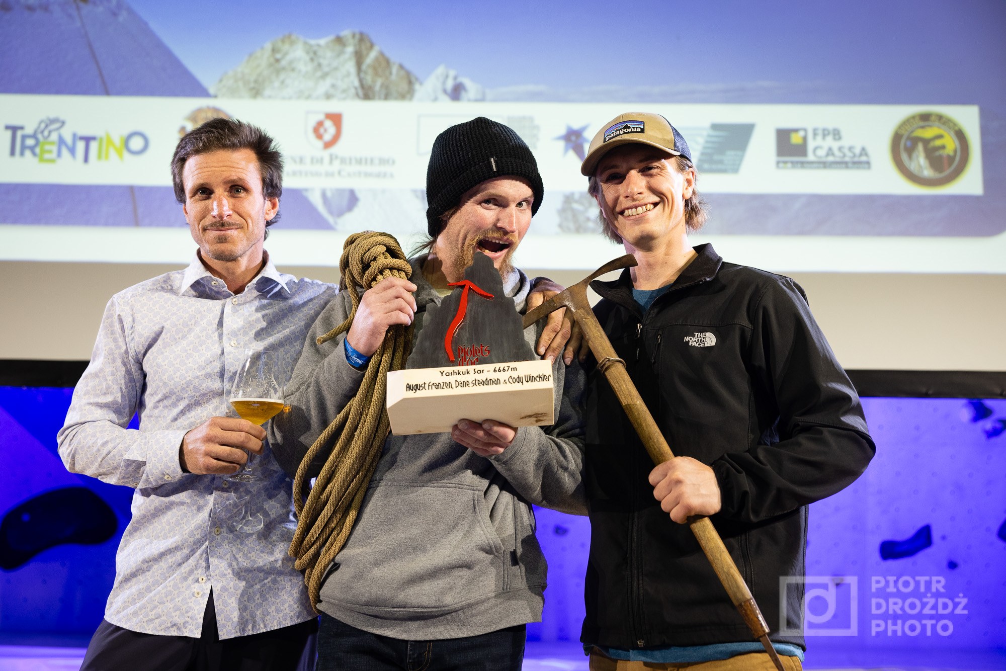 Il premio a Benjamin Vedrines. Foto Piotr DrodzÈ stata una grande festa della montagna e dell’alpinismo, in una dimensione sia internazionale, grazie alla partecipazione di alpinisti e giornalisti provenienti da diverse parti del mondo, che valligiana e locale, quella di San Martino di Castrozza, con la presenza, tra gli altri, delle Aquile diSan Martino, le storiche guide alpine.