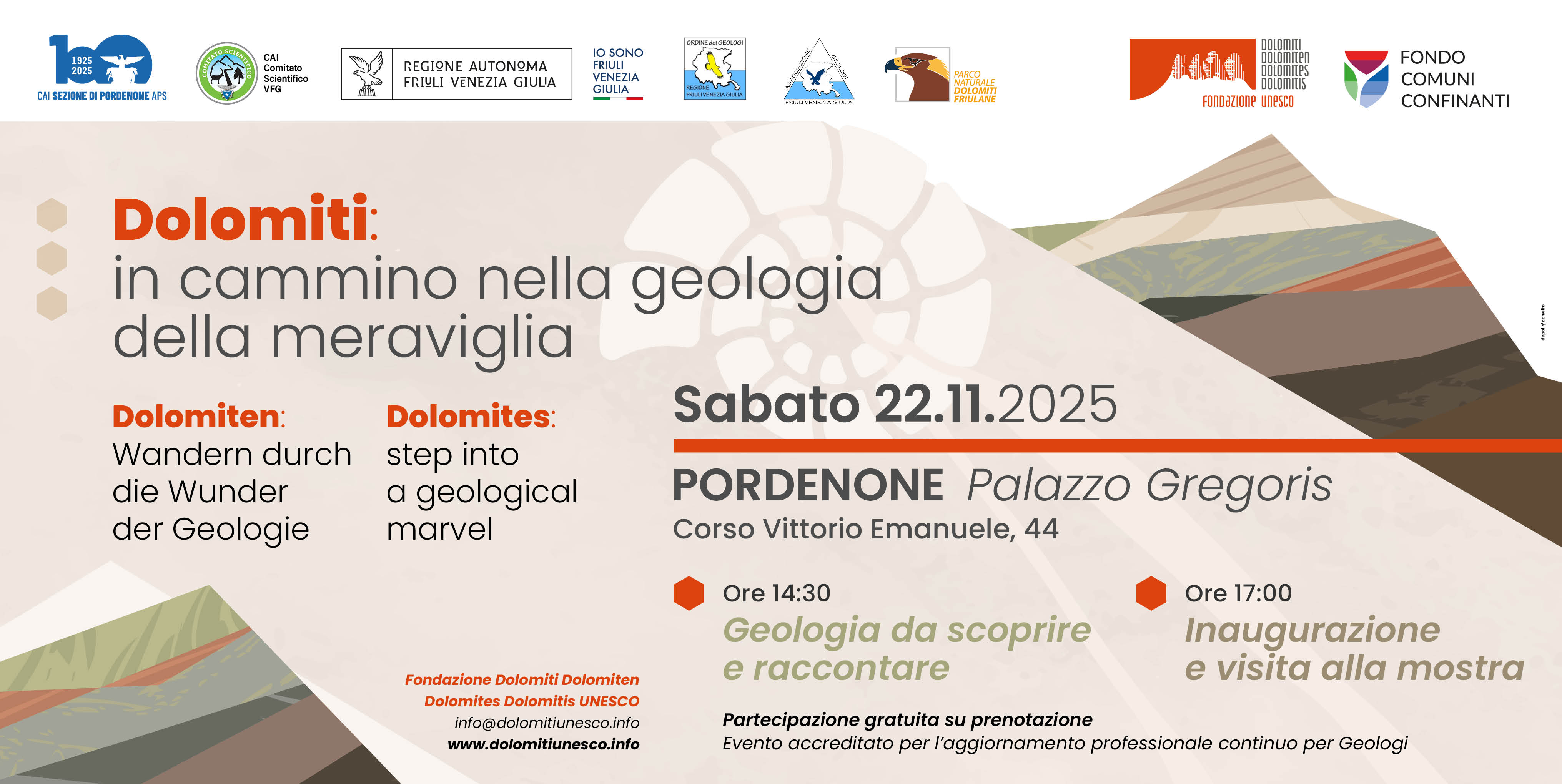 L’inaugurazione si terrà sabato 22 novembre alle 14:30, con la partecipazione di geologi ed esperti che accompagneranno il pubblico alla scoperta della geologia dolomitica, con particolare attenzione alle Dolomiti friulane. L’obiettivo è quello di tradurre i dati scientifici in conoscenza, consapevolezza e buone pratiche di frequentazione della montagna. L’evento nasce dalla collaborazione tra la Sezione CAI di Pordenone e la Fondazione Dolomiti UNESCO, con il sostegno della Regione autonoma Friuli Venezia Giulia, del Comitato scientifico Veneto Friulano e Giuliano del CAI, del Parco Naturale Dolomiti Friulane, dell’Ordine dei Geologi del Friuli Venezia Giulia e dell’Associazione dei Geologi regionale.