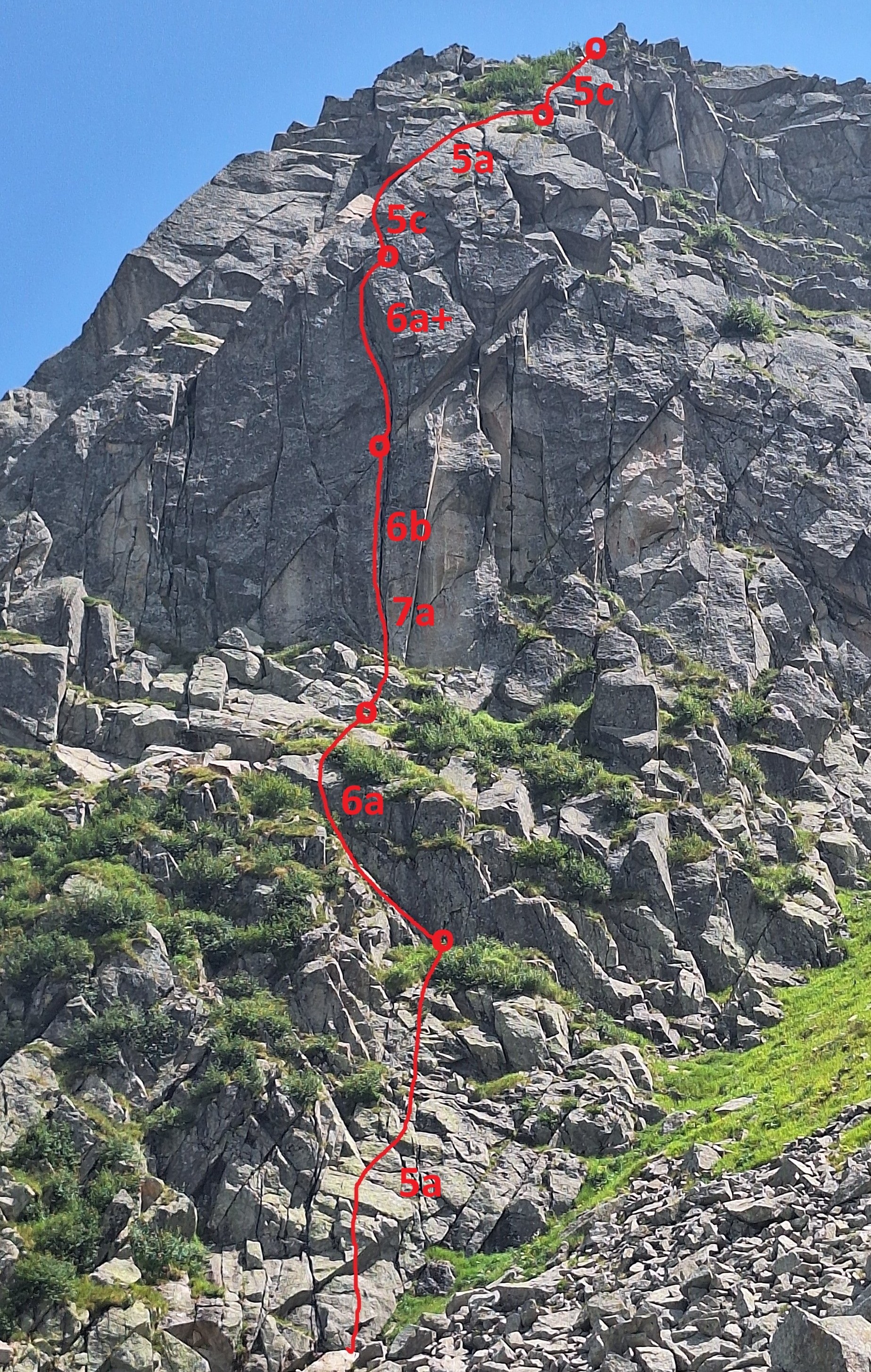 La via, eccetto la fessura, non presenta gradi di grande impegno, ma occorre considerare che “non si tratta di un itinerario plaisir, il grado bisogna averlo. Anche perché bisogna proteggersi, serve una bella serie di friend e non si può arrivare a mettere le protezioni con il fiato corto. Purtroppo o per fortuna il tiro duro è un po' sopra le righe rispetto al resto della via. È un 7a impegnativo, ma in un modo o nell'altro si passa, con un 6b, un 6b+. Ho lasciato un anello di cordino per aiutare. Le soste sono tutte a due fix con anello”.