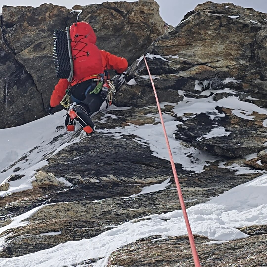 I tre hanno affrontato lo sperone nord della montagna in stile alpino, tracciando una linea di circa 1400 metri che hanno chiamato The Shining Wall. L’itinerario è caratterizzato da pendii di neve e ghiaccio fino a 70 gradi e passaggi di misto valutati M5.