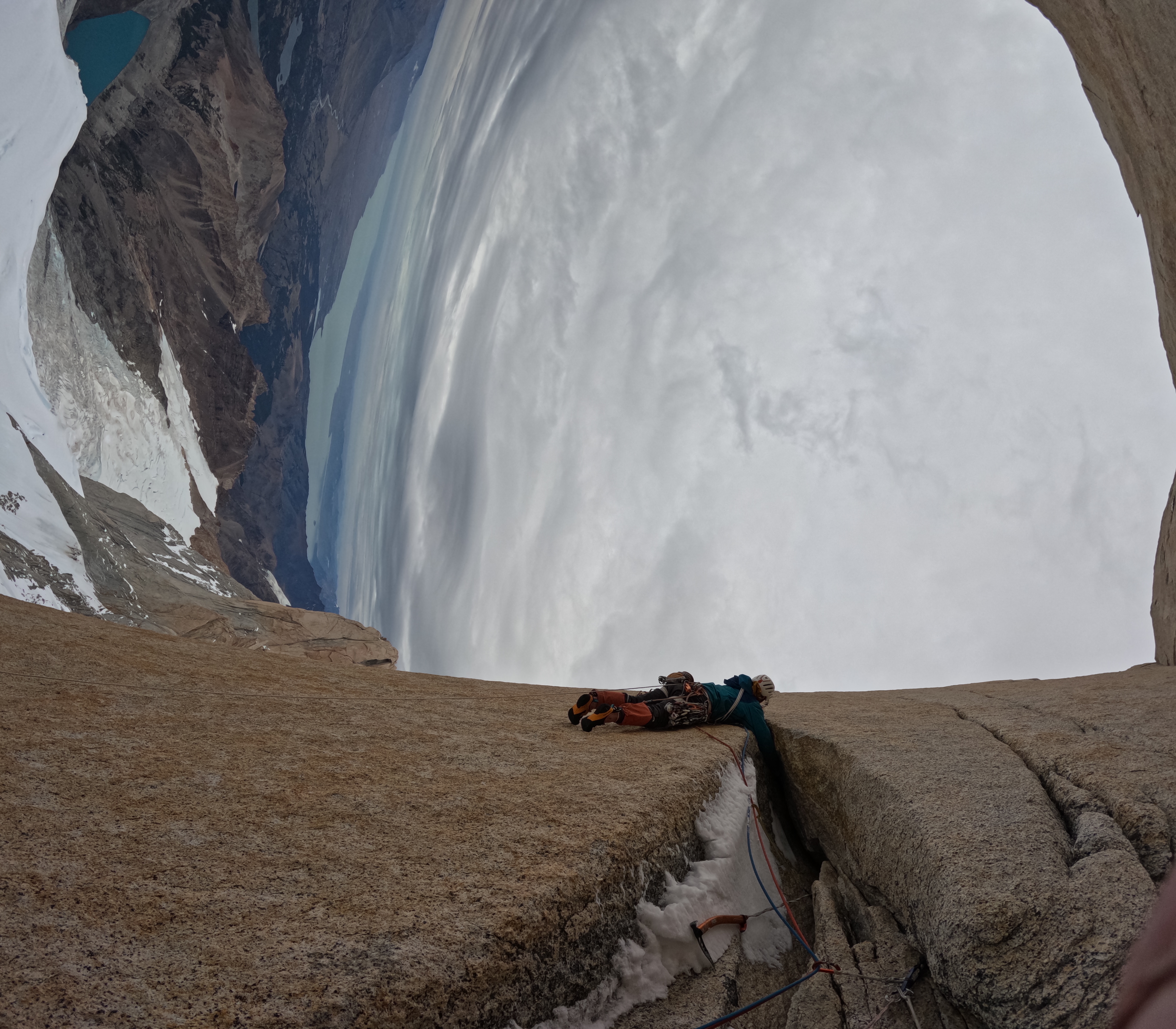 “Pensando agli apritori - racconta Seán - mi sorprende molto il fatto che le previsioni meteorologiche fossero allora praticamente assenti. Si tratta di un aspetto che ha cambiato decisamente i giochi, perlomeno qui in Patagonia. Pensare che all'epoca questa salita sia stata compiuta senza un supporto del genere è incredibile. E in parte rende più comprensibile, anche se non del tutto giustificabile, il fatto che abbiano lasciato tanto materiale in parete: quando non hai il privilegio di sapere che cosa ti aspetta, vuoi scendere il prima possibile. Pure le difficoltà tecniche mi hanno molto impressionato: in particolare un tiro, uno degli ultimi prima di arrivare in cima. Ho provato ad immaginare come devono averlo affrontato all'epoca, in un punto così esposto della salita, e dopo aver bivaccato per cinque notti in maniera sicuramente meno confortevole della nostra”.