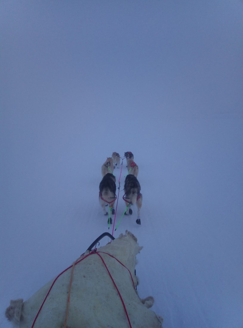 «Il Circolo Polare Artico ha cambiato me, i miei cani e il nostro rapporto. Il vento e la neve delle Alpi sono un’altra cosa rispetto alle bufere artiche. Qui il vento ti sposta anche se sei sdraiato. Con i miei compagni a quattro zampe ho vissuto in simbiosi un’esperienza nuova, in un contesto che nessuno di noi aveva mai sperimentato. I cani, come le altre volte, mi hanno consentito di vedere certe sfumature dei luoghi che non avrei notato se non fossero stati con me. Loro percepiscono, sentono, vedono. Durante la bufera © Fra Indi sono stato il più possibile vicino a loro, disteso nel sacco a pelo, per far sentire la mia presenza, per confortarci a vicenda».