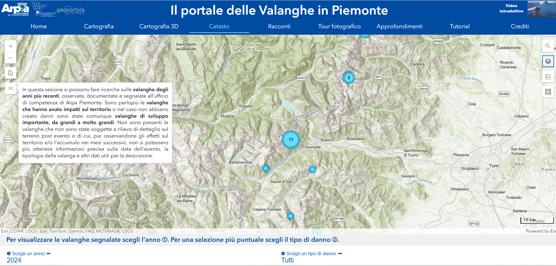 L’idea di costruire un qualcosa di più comunicativo e divulgativo, oltre a valorizzare e semplificare la componente tecnica era nella nostra mente da tempo e grazie alle nuove tecnologie e infrastrutture informatiche abbiamo potuto pubblicare nell’autunno del 2024 il Portale delle Valanghe in Piemonte. Esso è uno strumento più snello e crediamo più intuitivo, utilizzabile agevolmente anche con uno smartphone. Sul portale gli strumenti di lavoro per i tecnici sono conservati nelle pagine Cartografia e Cartografia 3d, completati e arricchiti da sezioni più divulgative. Nella pagina Racconti si possono scoprire storie sulle valanghe, del passato e del presente, che in qualche modo hanno lasciato il segno nella memoria collettiva. Il Tour Fotografico ci fa navigare su una mappa interattiva e scoprire una selezione accurata di fotografie, corredate di descrizioni. A collegare la parte tecnica alla sezione divulgativa si colloca la pagina Catasto. I Tool Approfondimenti e Tutorial completano il Portale per aiutare nella navigazione e anche approfondire le metodologie di redazione delle carte tematiche, i criteri di classificazione dei siti valanghivi e altri argomenti sul tema.