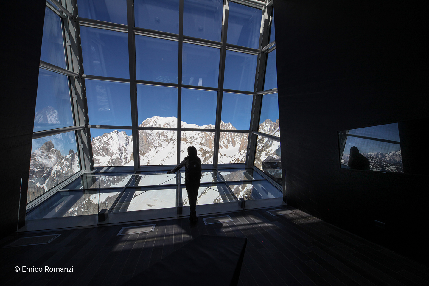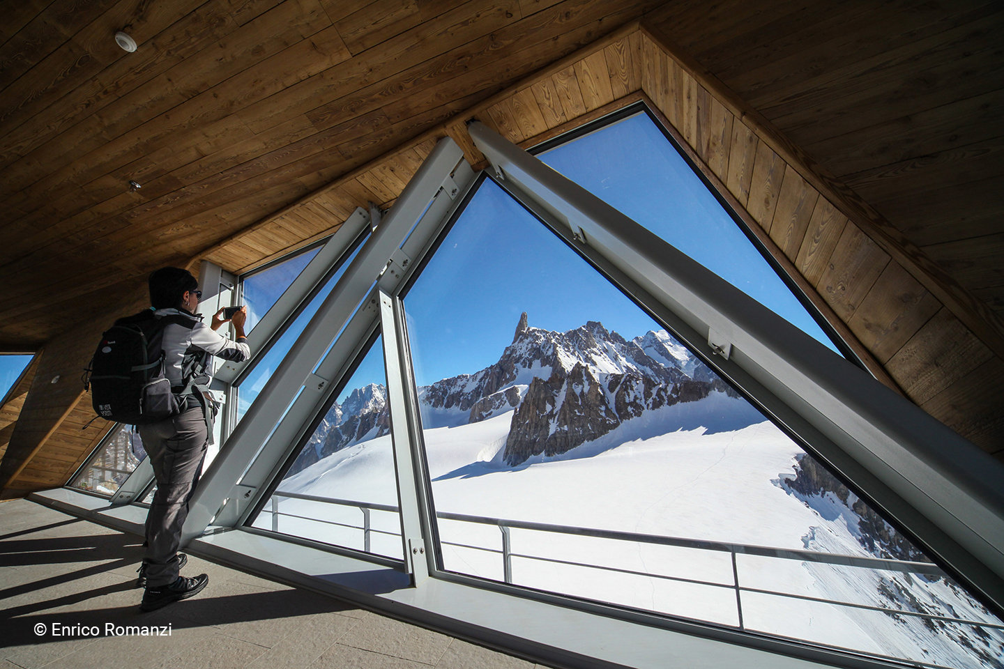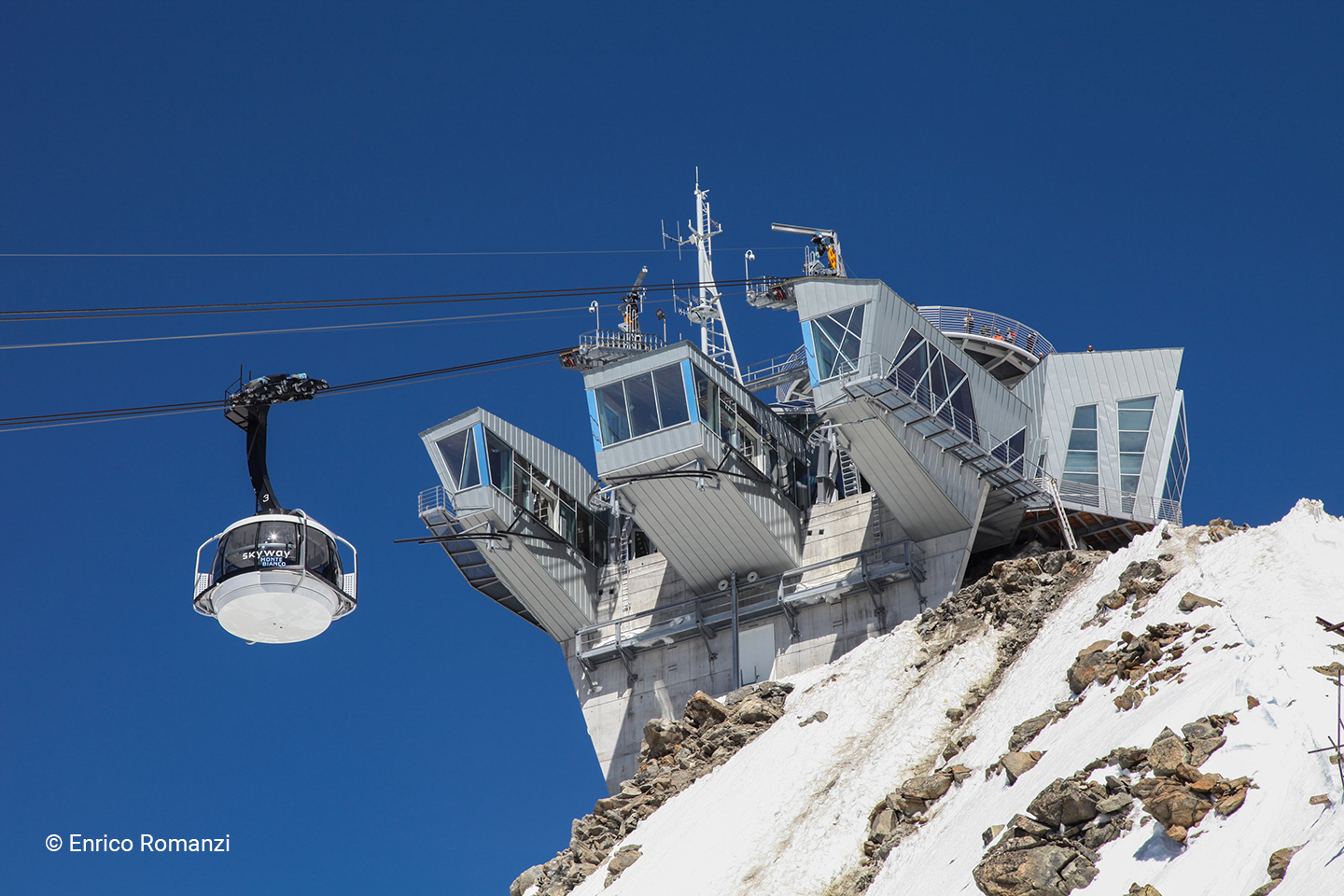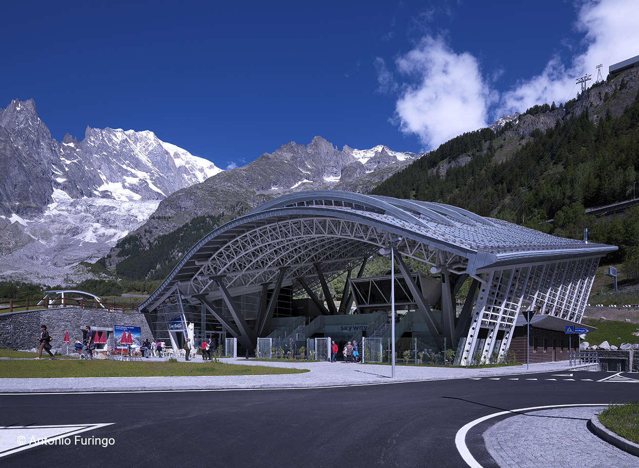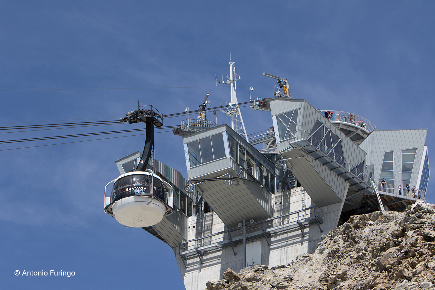 Tra i progetti selezionati, quello dedicato alla Valle d’Aosta porta in scena un’opera che più di ogni altra unisce tecnica e visione: la funivia del Monte Bianco.