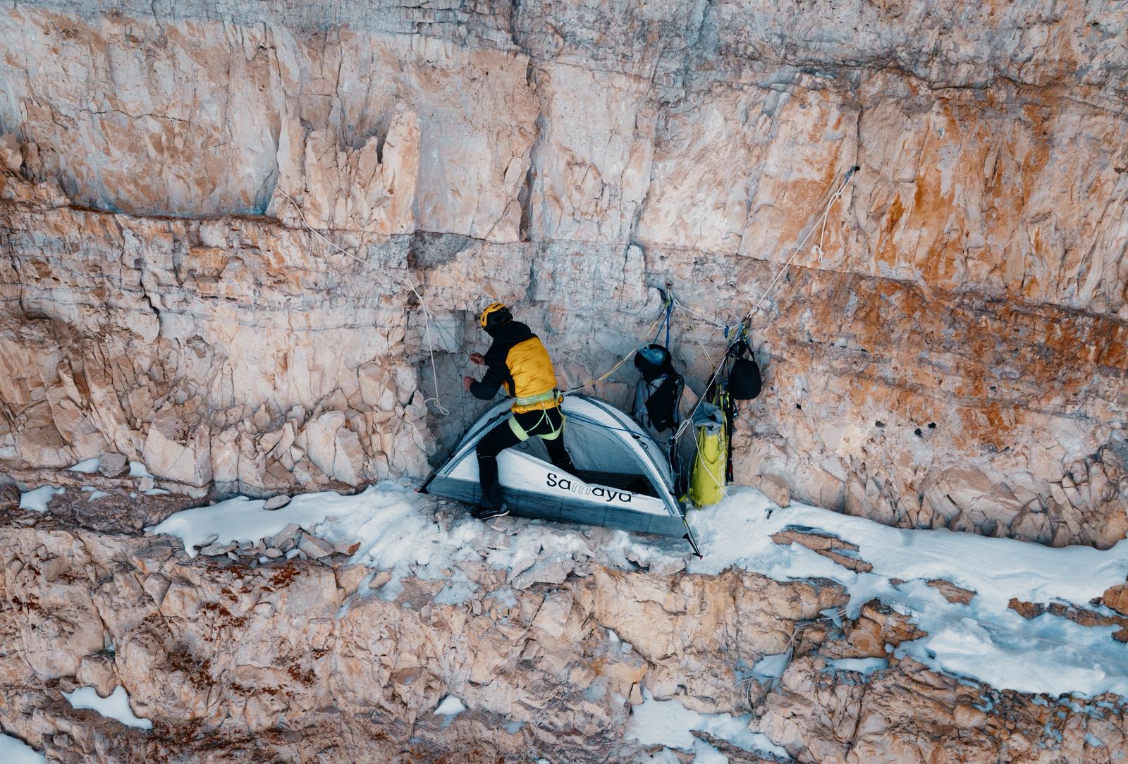 Senza farsi demoralizzare dal meteo, Simon ha allestito il suo bivacco sulla cengia della Hasse/Brandler, una stretta fascia al centro della parete. Una piccola tenda monoposto gli ha garantito a malapena uno spazio necessario e sufficiente. Le condizioni sono andate poi migliorando e sopra di lui il cielo si è fatto via via limpido e stellato, mentre le temperature notturne continuavano a scendere.