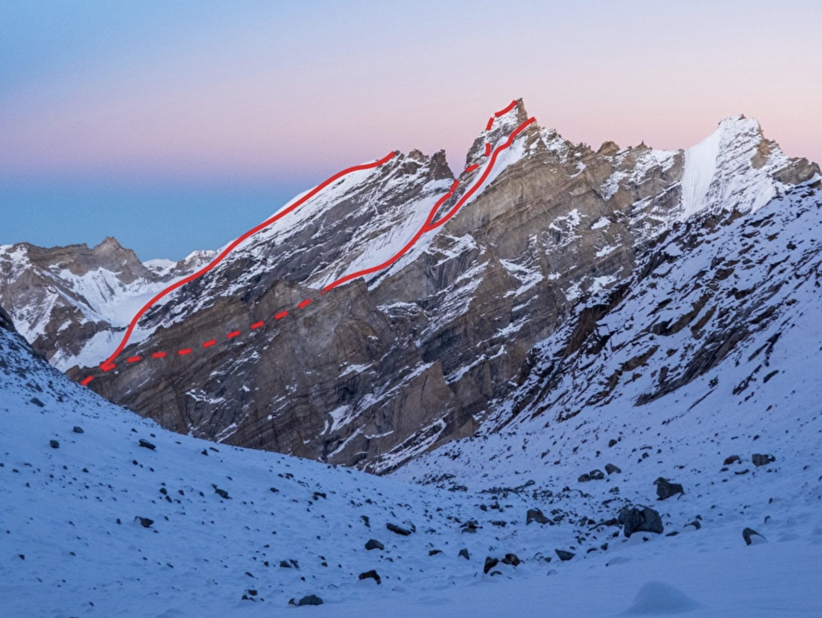 Così è stato anche per gli olandesi della Dutch NKBV Expedition Academy, che sul finire di questa estate sono partiti per la regione dello Zanskar, nel distretto di Kargil, in Ladakh. Il gruppo di quattordici scalatori (Folke Drost, Mael Durand, Claartje Meijs, Jan van der Meulen, Laura Oldenburger, Jules de Ruiter, Alexander Sternfeld, Joris Timmermans, Karlijn de Wit, più gli istruttori Court Haegens, Niek de Jonge, Eveline van Tuinen, Boris Textar e Bas Visscher) è partito a fine agosto per l'India, dopo due anni e mezzo di preparazione. Dopo una settimana di viaggio e avvicinamento, il team ha stabilito il campo base a 4600 metri nella valle di Denyai Tokpo, dove ci sono diversi Cinquemila e Seimila da scalare su ottimo granito. A causa del difficile attraversamento di un fiume è stato possibile trasportare solo metà dell’equipaggiamento e nei giorni successivi il maltempo ha flagellato il campo base, con forti nevicate. Secondo alcuni locali si è trattata di una delle più importanti tempeste degli ultimi quarant'anni, in un luogo che altrimenti in quel periodo è piuttosto secco.