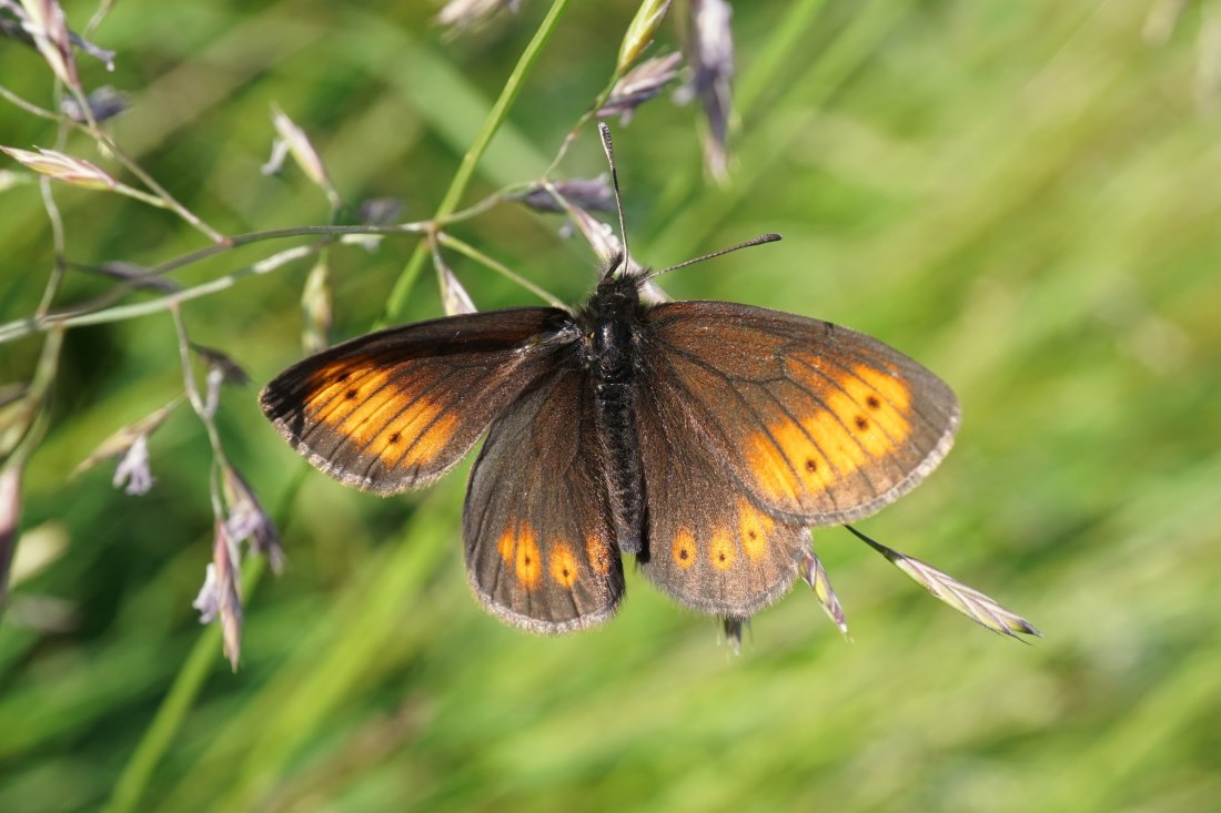 Un esemplare di Erebia medusa, farfalla comune tra i prati dell’Appennino Parmense. © G. XulescuL’alta Val Taro presenta ambienti ancora piuttosto selvaggi, nonostante la vicinanza con strade e paesi. I segni della presenza dell’uomo, muretti a secco, mulattiere, casolari sperduti, si confondono tra i grandi boschi e le radure, lungo i crinali delle montagne e nelle valli. Tra i molti sentieri di questo lembo di Emilia affacciato verso la Liguria, suggeriamo la facile salita al Monte Orocco dal borgo di Caneso, come alternativa alla più classica e agevole salita dal Passo della Tabella. Il grande cupolone della vetta si raggiunge invece dal versante orientale, seguendo antiche mulattiere nel bosco, a tratti pochi evidenti, e poi lungo l’erboso crestone est. Dalla cima si apre un notevole colpo d’occhio sul territorio circostante, con una visione d’impatto sul Monte Penna, iconica vetta del Parco Naturale dell’Aveto, e l’orizzonte che può mostrarsi fino al mare. È necessaria un po’ di attenzione nella parte bassa per non perdere il tracciato, che rischia a tratti di scomparire, nascosto dalla vegetazione e dal trascorrere del tempo. Un itinerario dove è raro incontrare qualcuno, soprattutto nelle mezze stagioni, che consente di ammirare una grande ricchezza di ambienti, boschivi e prativi. Per i più allenati, c’è la possibilità di realizzare un bell’anello dalla località di Case Gelana, a breve distanza da Bedonia, passando per Caneso, il Monte Orocco, il Passo del Segarino e Momarola.