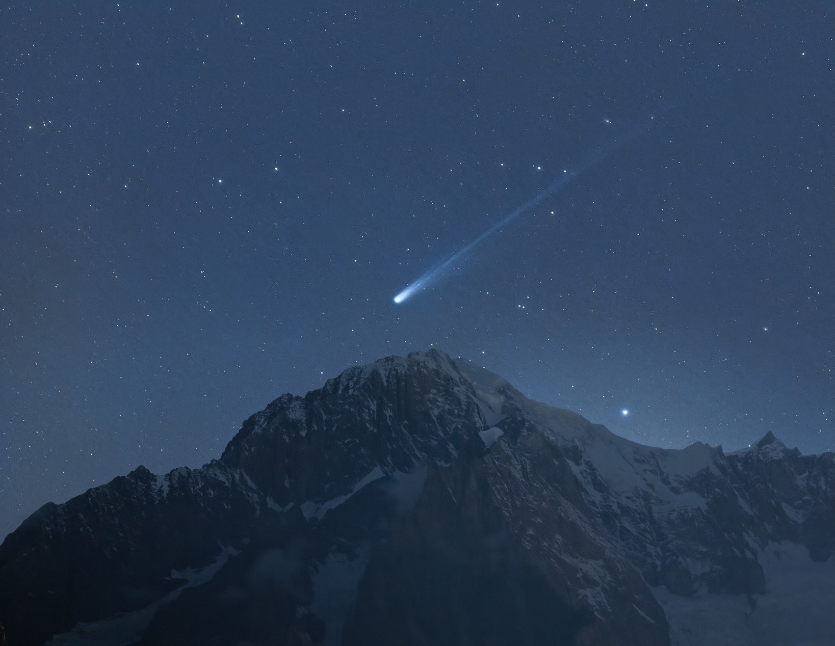 La Cometa Lemmon fotografata sul Monte Bianco da Valerio Minato. Foto Facebook Valerio MinatoArriva dal Monte Bianco il nuovo scatto di Valerio Minato, il fotograto torinese famoso per i suoi scatti sul Monviso e per gli allineamenti impossibili. Questa volta ha realizzato un’immagine che unisce la grandezza della Terra alla poesia del cielo. Davanti a lui, la Cometa Lemmon brilla sopra la cima più alta delle Alpi. L’atmosfera rarefatta dell’alta quota e la limpidezza dell’aria rendono la scena quasi irreale: la luce verde della cometa taglia l’oscurità, mentre la neve riflette il silenzio di un mondo che, per un istante, sembra fermarsi. Come commenta lo stesso Valerio Minato, pubblicando la foto: “Un frammento di universo che attraversa la notte”.