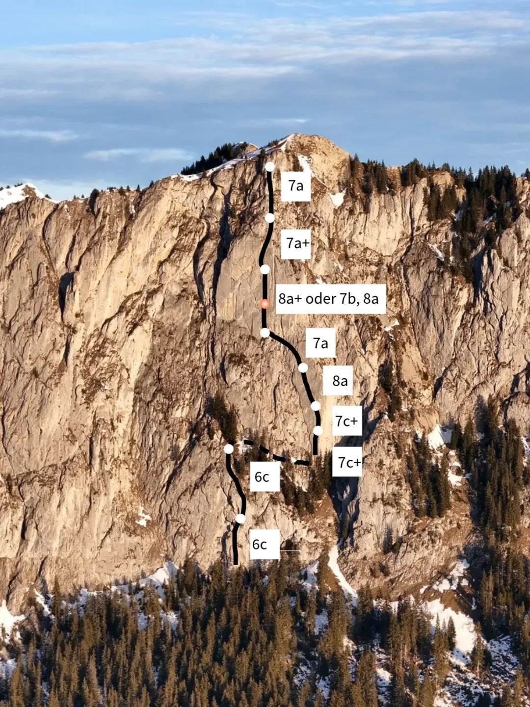 La cordata ha scalato la via per quella che era, adeguando le protezioni in un solo punto. “Sul quinto e più difficile tiro (8a+), abbiamo messo un chiodo al centro, in un riposo senza mani, utilizzando un chiodo esistente e un friend, per ridurre il trascinamento della corda in quel lungo tiro. Così facendo abbiamo spezzato il tiro in un 7b e un 8a. Non fa una grande differenza, ma è sicuramente più comodo scalare. Silvan tra l'altro ha superato il tiro al suo primo tentativo e a quel punto sapevo che la libera era in pieno svolgimento. L'ho deluso e ho controllato a fondo il tiro ancora una volta, visto che ancora non avevo assolutamente alcuna soluzione. Ma grazie ai consigli di Silvan, il puzzle è stato risolto rapidamente, e dopo una breve pausa, sono riuscito anch'io a salirlo. Abbiamo poi risolto i successivi due tiri di 7a il più velocemente possibile”.